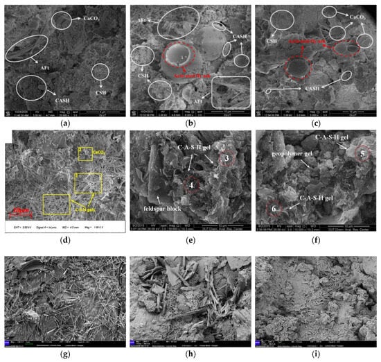 As shown in Figure 6a–c [], under alkaline excitation, the matrix incorporating activators exhibited a denser structure than the blank matrix, with fly ash and YRS particles encapsulated by C–S–H and C–A–S–H gels. Similarly, in Figure 6d [], the addition of Ca(OH)2 led to the formation of abundant honeycomb and fibrous C–S–H gels, enhancing matrix densification and reducing average pore size. In the Na2CO3 and Na2SO4 systems (Figure 6e,f), hydration between sediment and activator was limited. The resulting structure was loose, with flocculated geopolymer gels coexisting with unreacted matrix and feldspar clasts wrapped in gels. In the acidic systems (Figure 6g–i []), the 1.5% phosphoric acid group produced abundant needle-like and flocculent hydration products, forming a dense and continuous gel skeleton. These products included C–S–H gels, Ca(OH)2 crystals, and Ca3(PO4)2, effectively filling pores and increasing strength. In contrast, the 1% acetic acid and 1.5% hydrochloric acid groups also generated C–S–H gels and calcite, but with lower product content and poor connectivity, resulting in weaker excitation effects than the phosphoric acid group.