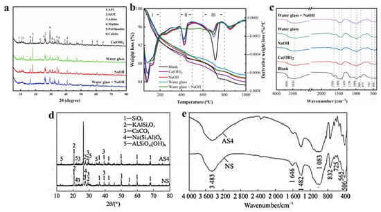 XRD, TG and FTIR patterns of the prepared filling materials from Yellow River sediments under different excitants. (a–c) Ca(OH)2, NaOH, water glass, water glass + NaOH []; (d,e) CaCl2 + water glass [].