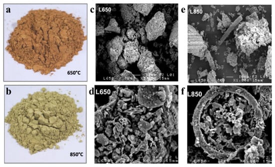 (a,b) Visual aspect of sediment heated at 650 °C and 850 °C; (c,d) SEM images at 650 °C with magnifications of 1kx and 6kx; (e,f) SEM images at 850 °C with magnifications of 1kx and 6kx [].
