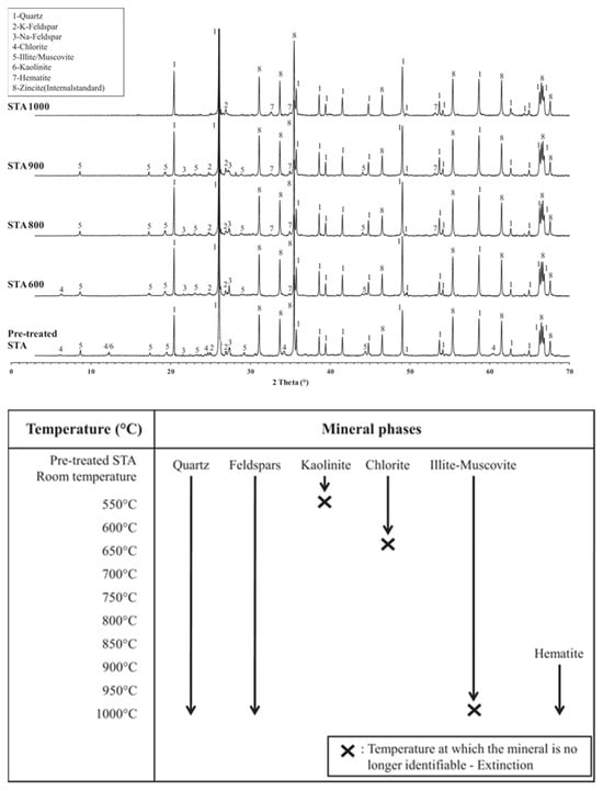 Figure 9 presents XRD patterns at various calcination temperatures. Quartz remained thermally stable between 550 and 1000 °C. Feldspar showed peak shifts but incomplete decomposition at 1000 °C. Clay minerals, especially kaolinite, underwent major changes—its (001) peak disappeared above 550 °C, confirming dehydroxylation and the formation of amorphous metakaolinite (Al2O3·2SiO2), which improved pozzolanic activity [,]. Although reactivity increased up to 800 °C, temperatures above 950 °C reduced activity due to mullite crystallization. Chlorite began dehydroxylation at 650 °C and completed by 800 °C, indicating a narrow activation window []. Cook []. noted its recrystallization near 850 °C. Illite and muscovite were more thermally stable, with peaks present even at 950 °C, where they became most reactive [,]. Hematite was the only recrystallized mineral detected, with peaks appearing from 600 °C and intensifying at higher temperatures, indicating progressive crystallization. Thus, thermal treatment at 550–950 °C effectively activates clay-rich dredged sludge, with careful temperature control key to optimizing amorphous phase formation [].