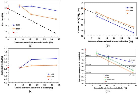 (a) Amount of bound water (between 105 °C and 400 °C) versus the amount of treated sediment in the slurry (The dashed line presents the amount of bound water corresponding to the part of Portland cement in the blended paste); (b) Amount of Ca(OH)2 in the slurry (by mass) versus the substitution ratio (The dashed line presents the amount of calcium hydroxide corresponding to the part of Portland cement in the blended paste); (c) Amount of CaCO3 in the slurry (by mass) versus the substitution ratio; and (d) 28-day compressive strength of the slurry versus the treated sediment and limestone filler substitution rates [].