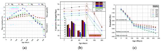 The above results indicate significant differences in the efficacy of chemical activators. The choice of the optimal activator depends on its overall performance in the chain of “destroying the original structure, providing reactive components, and forming stable products.” NaOH–water glass enhances gel formation and structure through synergistic effects in alkaline environments. Phosphoric acid, in contrast, produces a strong and durable microstructure through corrosion and stable precipitation in acidic conditions. However, the Cl− introduced by CaCl2 induces steel corrosion, posing a serious threat to long-term durability and greatly limiting its practical application.