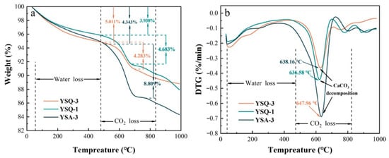 The hydration products and microstructures of the fillers changed significantly under different activators. XRD results showed that doping with Ca(OH)2, NaOH, water glass, or CaCl2 increased C–S–H and C–A–S–H gel formation. Co-doping with NaOH and water glass depleted Ca(OH)2, while excitation with CaCl2 eliminated natrium feldspar peaks and introduced kaolinite peaks, indicating ion exchange and mineral transformation (Figure 7a,d). TG analysis confirmed that activators enhanced hydration reactions. Dehydration of products increased with Ca(OH)2 depletion, CaCO3 content decreased, and gel production rose significantly (Figure 7b). FTIR results showed that doping eliminated Ca(OH)2 characteristic peaks, caused shifts in Si–O peaks, and CaCl2 enhanced O–H absorption peaks, indicating increased hydroxyl content that promoted particle bonding. Overall, excitants significantly improved hydration and microstructural densification (Figure 7c,e) [,].