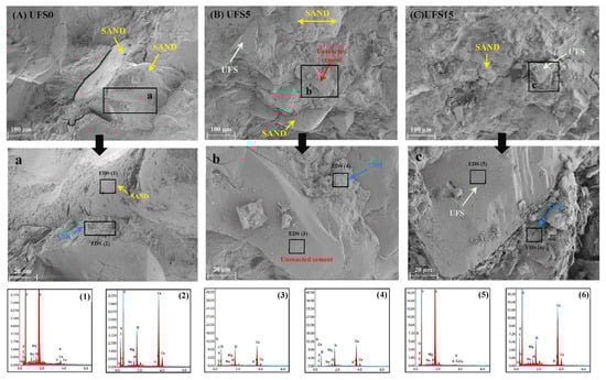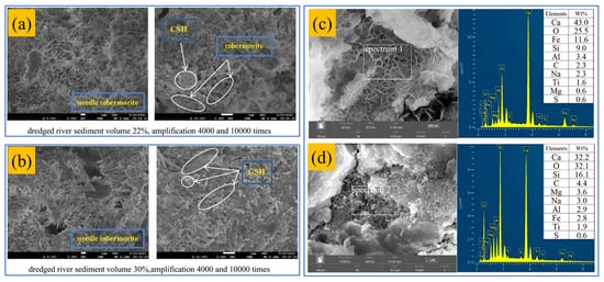 Although the fine-grained sediments are used as a high silica–alumina material, their activity is low and cannot directly participate in the hydration reaction. Although a series of activation measures have been taken, with the gradual increase in the dosage of its replacement cementitious material, the generation efficiency of hydration products such as C–S–H and C–A–S–H will still be affected, resulting in a gradual decrease in the macro-mechanical properties of the specimen. Deposited fine sand also introduces excessive defects, leading to the loss of properties when the substitution rate is too high []. Therefore, there is an urgent need to continue to investigate the performance enhancement mechanism of sediment-deposited concrete on this basis.
