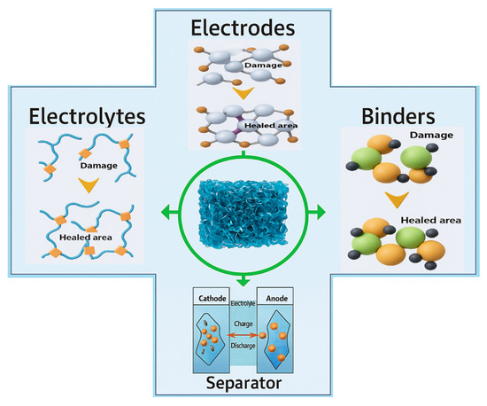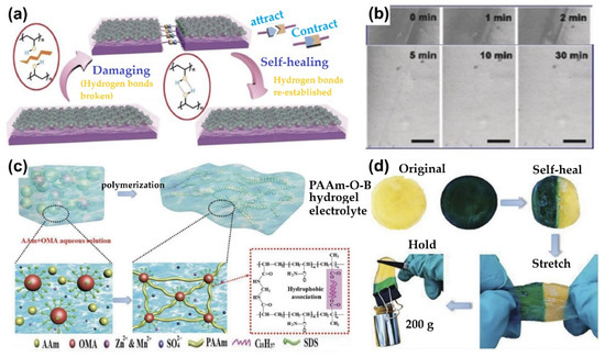 Recent research has demonstrated the versatility of hydrogels in various roles across energy devices. In batteries, hydrogels have been employed as solid-state electrolytes, separators, and electrode binders, offering improved ion transport, enhanced interfacial contact, and mechanical adaptability [19,20]. Moreover, hydrogels have being explored as electrolyte matrices for energy storage materials [21,22]. The development of multifunctional hydrogels—engineered to exhibit properties such as self-healing [23], stretchability [24], thermo responsiveness [25], and shape memory [26]—has further expanded their applicability. These advanced hydrogels can adapt to mechanical deformation, recover from damage, and respond to environmental stimuli, thereby enhancing the durability and reliability of energy devices [27,28]. For instance, self-healing hydrogels can autonomously repair microcracks in electrodes or electrolytes, extending device lifespan [29,30], while stretchable hydrogels enable the fabrication of flexible and wearable energy systems, aligning with the growing demand for portable and body-integrated electronics [31].