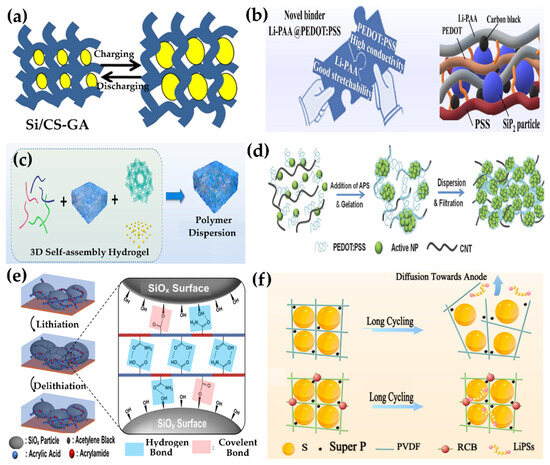- Hu, S.; Wang, L.; Huang, T.; Yu, A. A Conductive Self-Healing Hydrogel Binder for High-Performance Silicon Anodes in Lithium-Ion Batteries. J. Power Sources 2020, 449, 227472. [Google Scholar] [CrossRef]
