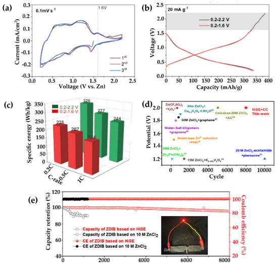 - Ma, L.; Chen, S.; Long, C.; Li, X.; Zhao, Y.; Liu, Z.; Huang, Z.; Dong, B.; Zapien, J.A.; Zhi, C. Achieving High-Voltage and High-Capacity Aqueous Rechargeable Zinc Ion Battery by Incorporating Two-Species Redox Reaction. Adv. Energy Mater. 2019, 9, 1902446. [Google Scholar] [CrossRef]