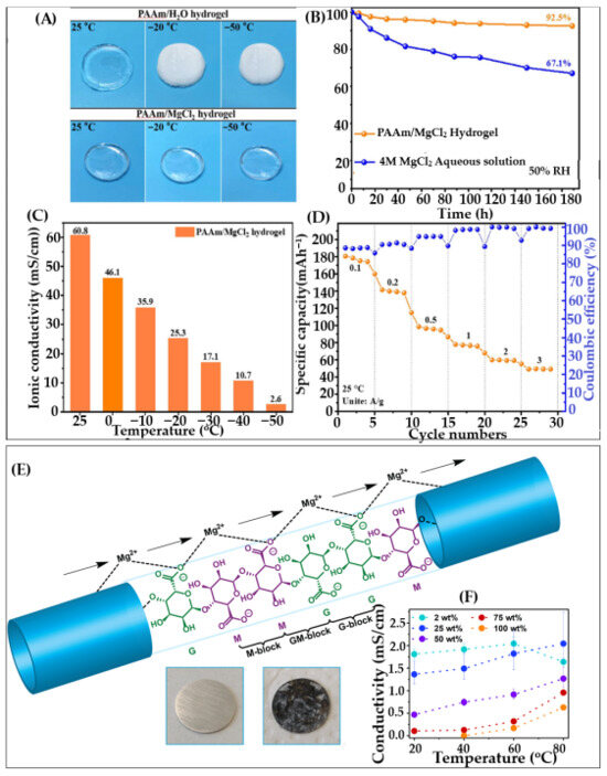- Kwakernaak, M.C.; Kiriinya, L.K.; Legerstee, W.J.; Berghmans, W.M.J.; Hofman, C.G.T.; Kelder, E.M. Magnesium Alginate as an Electrolyte for Magnesium Batteries. Batteries 2025, 11, 16. [Google Scholar] [CrossRef]