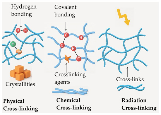 Hydrogels are typically synthesized via three principal approaches: physical crosslinking, chemical crosslinking, and irradiation-based crosslinking, each producing networks with distinct characteristics. These methods differ in the type of cross-links formed, the stability of the resulting hydrogel, and the complexity of synthesis (Scheme 1).