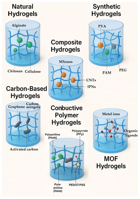 Hydrogels, with their three-dimensional polymeric networks and high water content, have become indispensable materials in energy storage and conversion technologies. Their ability to facilitate ion transport, maintain mechanical flexibility, and incorporate functional additives makes them ideal for use in batteries, supercapacitors, fuel cells, solar cells, and metal-air batteries. Based on their origin, composition, and functionalization, hydrogels used in energy applications can be broadly categorized into six main types: natural, synthetic, composite, carbon-based, conductive polymer, and metal–organic framework (MOF) hydrogels (Scheme 5).