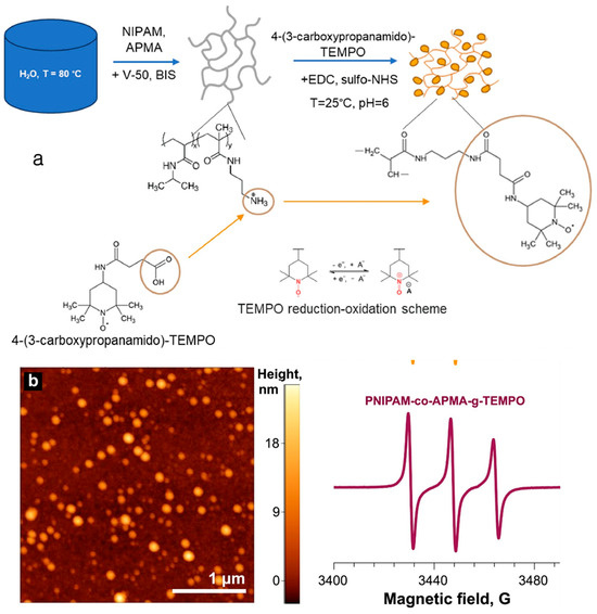 (a) Synthesis of PNIPAM-co-APMA-g-TEMPO nanogels; (b) AFM image and EPR spectra of PNIPAM-co-APMA nanogels (reused with copyright permission from ref. [16]).