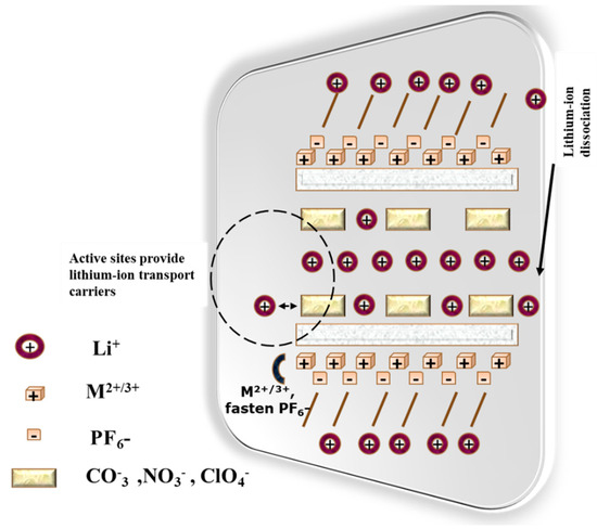 A battery electrolyte is a material which allows the movement of ions between the anode and cathode, enabling the electrochemical reactions necessary for energy storage and release. The electrolyte can be solid, liquid or gel, depending on the battery type. Gel electrolytes are a particular kind of electrolyte that possesses both liquid and solid characteristics [71]. In comparison to completely solid electrolytes, they are made to function better while overcoming the drawbacks of liquid electrolytes, such as evaporation and leakage [72]. Considering the applications and chemistry, the battery electrolyte has different types, like liquid electrolyte, solid polymer electrolyte, nanocomposite electrolyte, nanogel electrolyte, and molten salt electrolyte [73]. Among them, the nanogel electrolyte represents great advancement for future advancements in battery technology. The nanogel electrolyte is categorized as a special type of polymer electrolyte which mixes the properties of gel and composite electrolytes, showing significant performance in lithium-ion batteries. Due to the important key aspects, the nanogel electrolyte outperforms the conventional electrolyte types. Those aspects are higher ionic conductivity, improved stability, better mechanical strength, good thermal stability, and improved electrochemical performance. For example, gels that include BaTiO3 nanoparticles exhibit reduced conductivity and significantly more weight loss than the silicate nanogel [74,75]. The common examples of nanogel electrolytes are Li-fluorohectorite-based nanogel electrolytes, PVDF-HFP nanogel electrolytes, nanogel electrolytes with LiCF3SO3, and silica-based nanogel electrolytes. The nanogel electrolyte is responsible for executing several key roles in enhancing the performance and stability of batteries, like high ambient conductivity, mechanical robustness, metal electrode stability, reducing interfacial impedance, thermal stability, and flexibility. Wang et al. [29] reported the nanofiber gel electrolyte (Nano-GPE) composed of poly (vinylidene fluoride)-hexafluoropropylene copolymer exhibits excellent physical properties. To enhance the material’s characteristics, the modification involved the introduction of magnesium–aluminum-bilayered nanosheets (MgAl-LDs) integrated with different acidic ions. The Nano-GPE demonstrates outstanding properties, including an elongation at a break of 166% and a tensile strength of 6.95 MPa, indicating that the material is both strong and flexible—qualities that are essential for battery applications. For the stability and safety of lithium batteries, the electrochemical window of the electrolyte plays a crucial role; it has been reported to exceed 5 V. Additionally, it was found that the NO3− ionic conductivity is elevated, which facilitates improved ion transport. Lithium batteries using the Nano-GPE modified by MgAl-LDs (NO3−) show enhanced performance across current densities ranging from 0.1 to 2 C. They achieve a discharge capacity of 155 mAh/g at 0.1 C and a reversible capacity of 135 mAh/g, while retaining 90% capacity after 100 cycles at 0.5 C, demonstrating remarkable cycling stability. Figure 4 illustrates the ion exchange diagram. Overall, the Nano-GPE exhibits promising performance and has potential applications in flexible and high-density solid-state batteries, addressing the growing demand for energy storage solutions across various sectors, particularly in portable and flexible electronics. Furthermore, it offers economic viability, providing an affordable option without sacrificing performance [29].