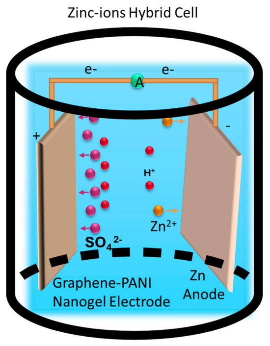 Nanogel electrodes consist of nanogel materials of nanoscale size, leading to enhanced conductivity and functionalities. These electrodes are frequently used in metal (example: Li+, Zn2+, Na+) ion batteries, supercapacitors, biomedical devices and soft electronics [80,81]. Jianwei et al. developed a zinc-ion hybrid cell by using a graphene and polyaniline (GP-PANI)-conducting polymer composite nanogel as an electrode. The Zn-ion hybrid cell (ZiHC) presents promising features to address these needs. To enhance its electrochemical performance, the ZiHC requires careful integration of materials and design concepts. It is structured with a capacitor-type cathode and a multivalent metal battery-type anode, specifically utilizing zinc (Zn) as the anode material shown in Figure 6. This combination capitalizes on the benefits of both capacitor and battery technologies, aiming to achieve higher power and energy density. A significant innovation in this development is the use of a 3D graphene-PANI composite hydrogel as the cathode. This material features an intelligently engineered three-dimensional (3D) nano-architecture, which increases the active interface between the electrode and electrolyte. This design is expected to enhance the overall capacity and efficiency of the ZiHC [82,83].