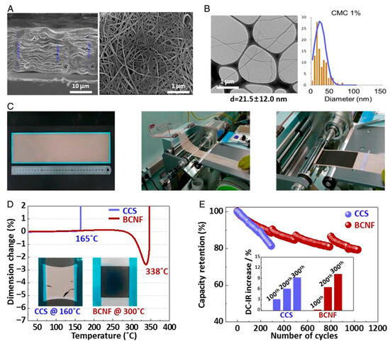 Bacterial cellulose nanofiber (BCNF) membrane and battery performances. (A) Scanning electron microscopy (SEM) depicts the BCNF membrane in both side (left) and top (right) views. (B) BCNF is made with 1% carboxymethylcellulose (CMC) and its diameter distribution using transmission electron microscopy (TEM). (C) large-area BCNF membrane and roll-to-roll production of a cylindrical LIB complete cell. (D) Thermomechanical analysis (TMA) of the BCNF and ceramic-coated separators (CCS). The BCNF demonstrated a significantly greater thermal tolerance up to 338 °C, higher than the CCS, which had a tolerance of 165 °C. The thermal resistance in a fixed frame at 160 °C (CCS) and 300 °C (BCNF) is displayed in the inset. (E) CCS and BCNF life cycle performances in entire cells of 18,650 batteries. After every 100 cycles at 25 °C, the relative direct current–internal resistance (DC-IR)-increasing ratios are displayed in the inset (Reused from reference [113]).