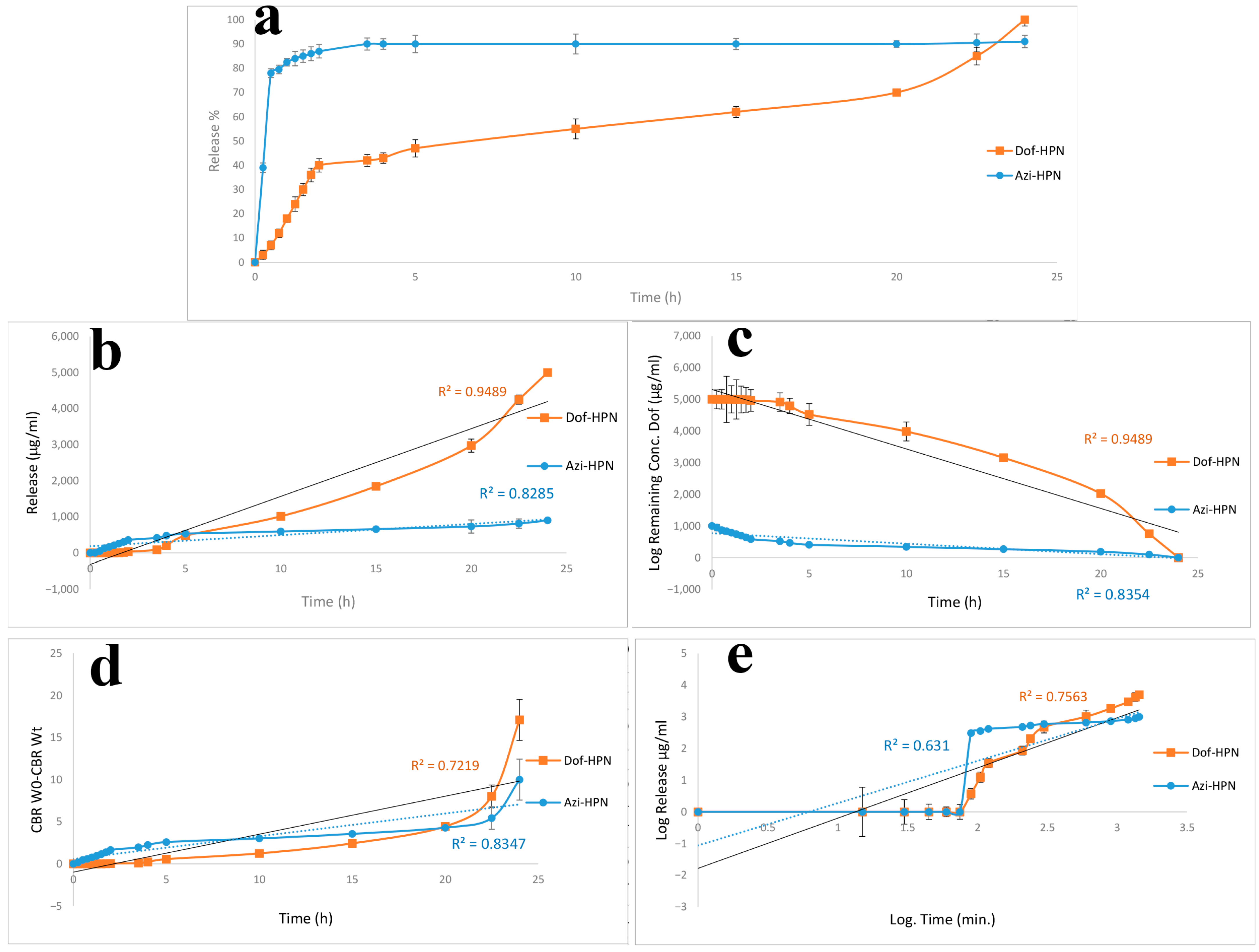 4.2.5. Drug Release and Release Kinetic Studies of Dof-HPN and Azi-HPN