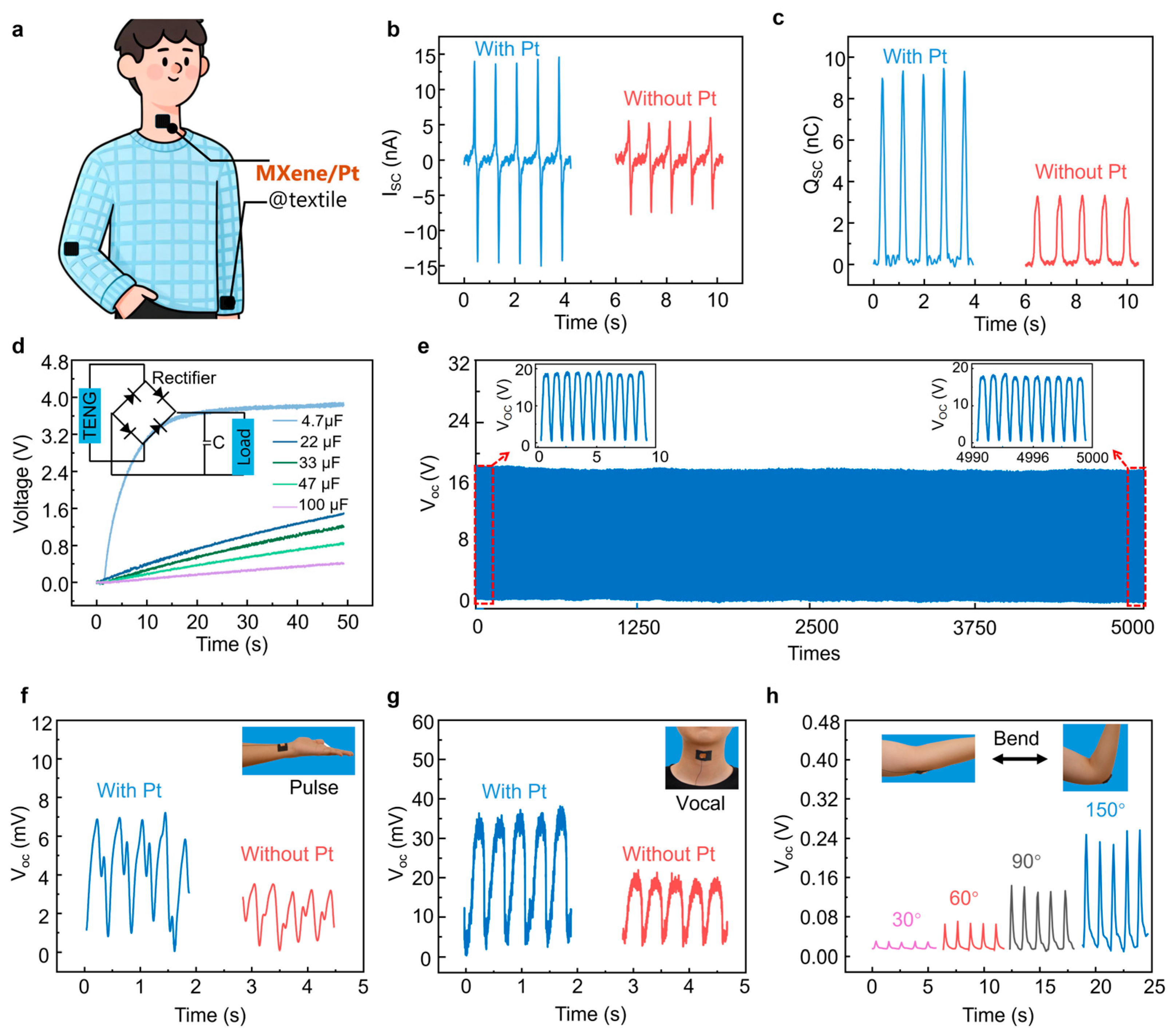 2.1. MXene/Pt@Textile: High-Performance Flexible Self-Powered Sensor