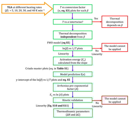Scheme of the procedure followed for the kinetic analysis of the thermal decomposition of organochlorinated hybrid silica xerogels. Orange arrows represent the initial data, green boxes and purple arrows indicate the calculation route, and red arrows and boxes represent situations in which the kinetic model is not applicable.