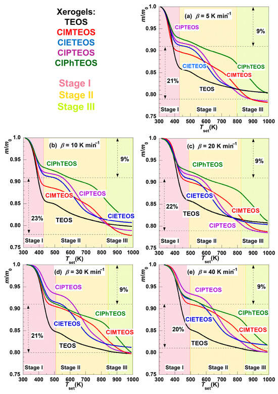 Figure 2 depicts the thermal evolution of the normalised mass loss (mloss) of the reference xerogel (synthesised using only TEOS) and the four organochlorinated hybrid xerogels ClMTEOS, ClETEOS, ClPTEOS, and ClPhTEOS (with 10% molar content of the corresponding ClRTEOS precursor) for a heating rate (β) of 5, 10, 20, 30, and 40 K min−1. The corresponding mloss data for each decomposition stage are listed in Table S1. The different organic moieties of the ClRTEOS materials produced different behaviours during their decomposition at constant heating rates. Nevertheless, at least two distinct thermal decomposition stages are evident in all cases.