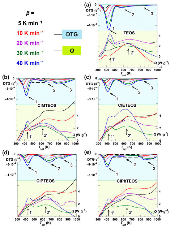 Evolution of the first-time derivative of the thermogravimetric curves (DTG, solid top curves and blue shading) and the heat flow (Q, bottom dotted curves and green lime shading) as a function of the programmed temperature for (a) the TEOS reference, and the hybrid xerogels: (b) ClMTEOS, (c) ClETEOS, (d) ClPTEOS, and (e) ClPhTEOS.