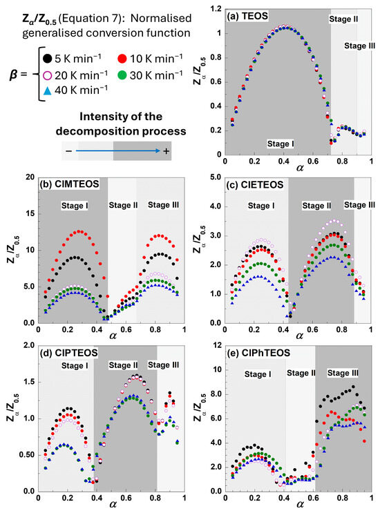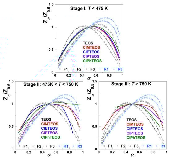 The simplest behaviour is found in the case of TEOS, with the first stage serving as the principal governing process. For the organochlorinated xerogels, the first stage occurs at a conversion degree of approximately α = 0.4 (40% of the total mloss), whereas the second and subsequent stages differ markedly in both the shape and extent of decomposition. The transition between the second and the third stages is not well defined, especially for ClMTEOS and ClPhTEOS, as the Zα/Z0.5 curve does not reach a value of zero, indicating the initiation of an alternative mechanism. This transition is almost imperceptible for TEOS and ClETEOS.
