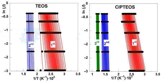 Although α varies from 0 to 1 in both graphs in Figure 5, the sensitivity of the study may not be equivalent within the whole range. The sensitivity will be linked to the relative mloss of each stage, which is quite different for each xerogel sample studied in this work, according to the results gathered in Figure 2. For example, the mloss associated with the first and second decomposition stages of TEOS corresponds to 14% and 6%, respectively, whereas mloss values of 8% and 12% are observed in the case of ClPTEOS, the third stage encompassing an additional mloss of 1%. The slope of the ln(β) vs. 1/T lines increases as the stages evolve, and this trend was also found for the rest of the organochlorinated xerogels (Figure S3).