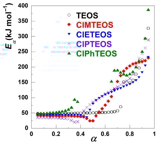 For the first stage, the Eα value ranges from 35 to 60 kJ mol−1, which relates to the release of the surface physiadsorbed solvent species. This process shows a direct correlation with the material textural properties, exhibiting higher Eα values for samples with greater mesoporous distribution [9,10,11]. The second stage covers the thermal decomposition of the chlorinated organosilane moieties and further condensation of the Si–OH groups. For this stage, the Eα values increase progressively with the thermal decomposition evolution, likely due to reduced accessibility of free silanol groups within the matrix. For the organochlorinated xerogels, the dehydroxylation reaction becomes less significant due to the lower amount of TEOS used in their preparation, resulting in silica matrices with a lower abundance of Si–OH groups. However, the use of a 10% molar content of ClRTEOS precursors introduces additional, alternative decomposition pathways due to the organochlorinated moieties. Furthermore, the collapse of the matrix porosity reduces the diffusion rate of decomposition products [22]. Notably, the determination of Eα was precluded for ClMTEOS and ClPhTEOS due to the markedly flat DTG evolution in their second decomposition stages (marked with dashed boxes in Figure 3). Kappert et al. reported that the Eα values for the dehydroxylation reaction are highly dependent on the conversion degree, ca. 150–300 kJ mol−1, whereas the degradation of the functional group in organosilica matrices requires slightly lower values, 160–190 kJ mol−1 [22].