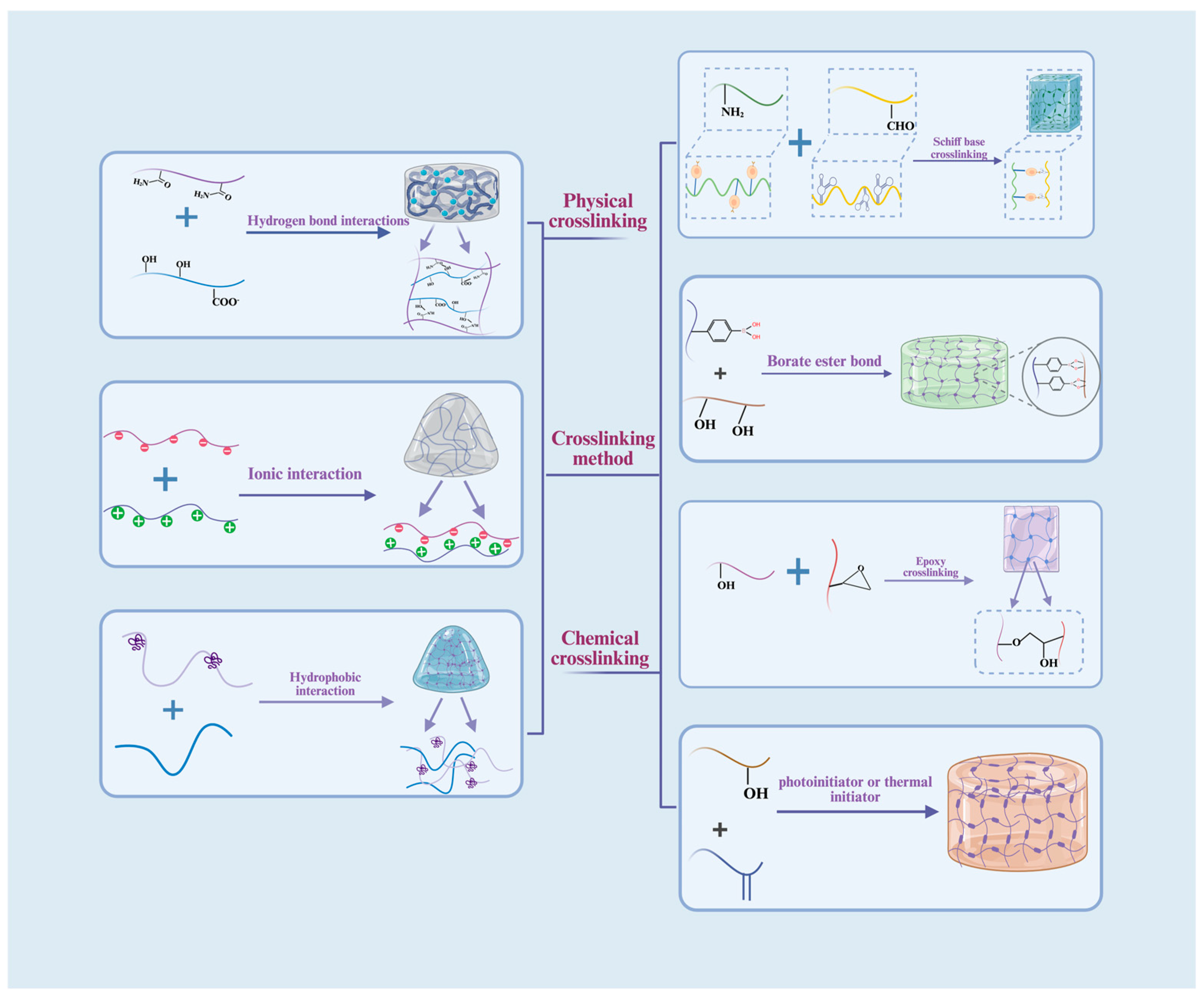 - Hu, W.; Wang, Z.; Xiao, Y.; Zhang, S.; Wang, J. Advances in crosslinking strategies of biomedical hydrogels. Biomater. Sci. 2018, 7, 843–855. [Google Scholar] [CrossRef] [PubMed]