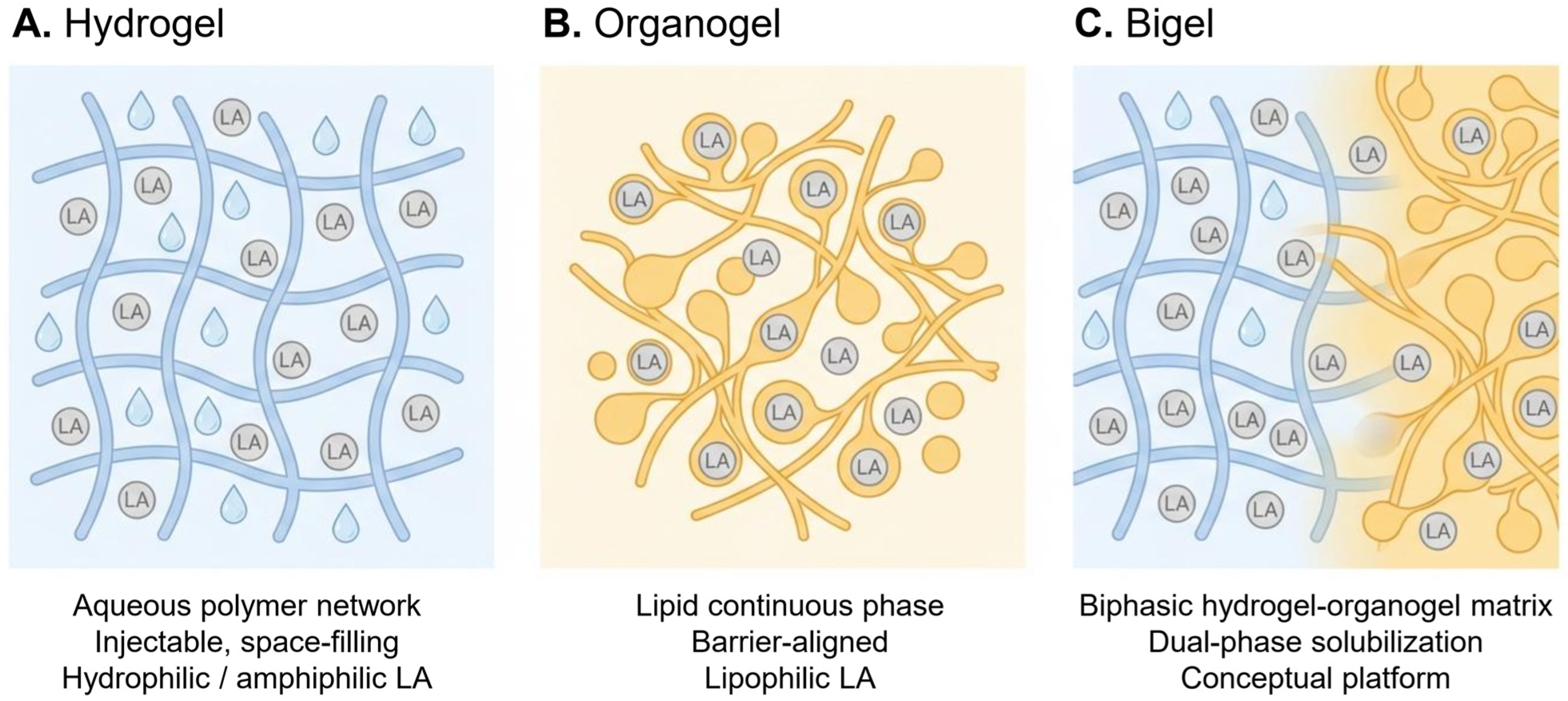 | Strengths | Conformable, injectable, mechanically robust, adaptive release capability | Excellent solubilization of lipophilic LAs; strong barrier matching; needle-free delivery | Integrates hydrogel and organogel advantages; potential multiphasic release and multi-agent design |