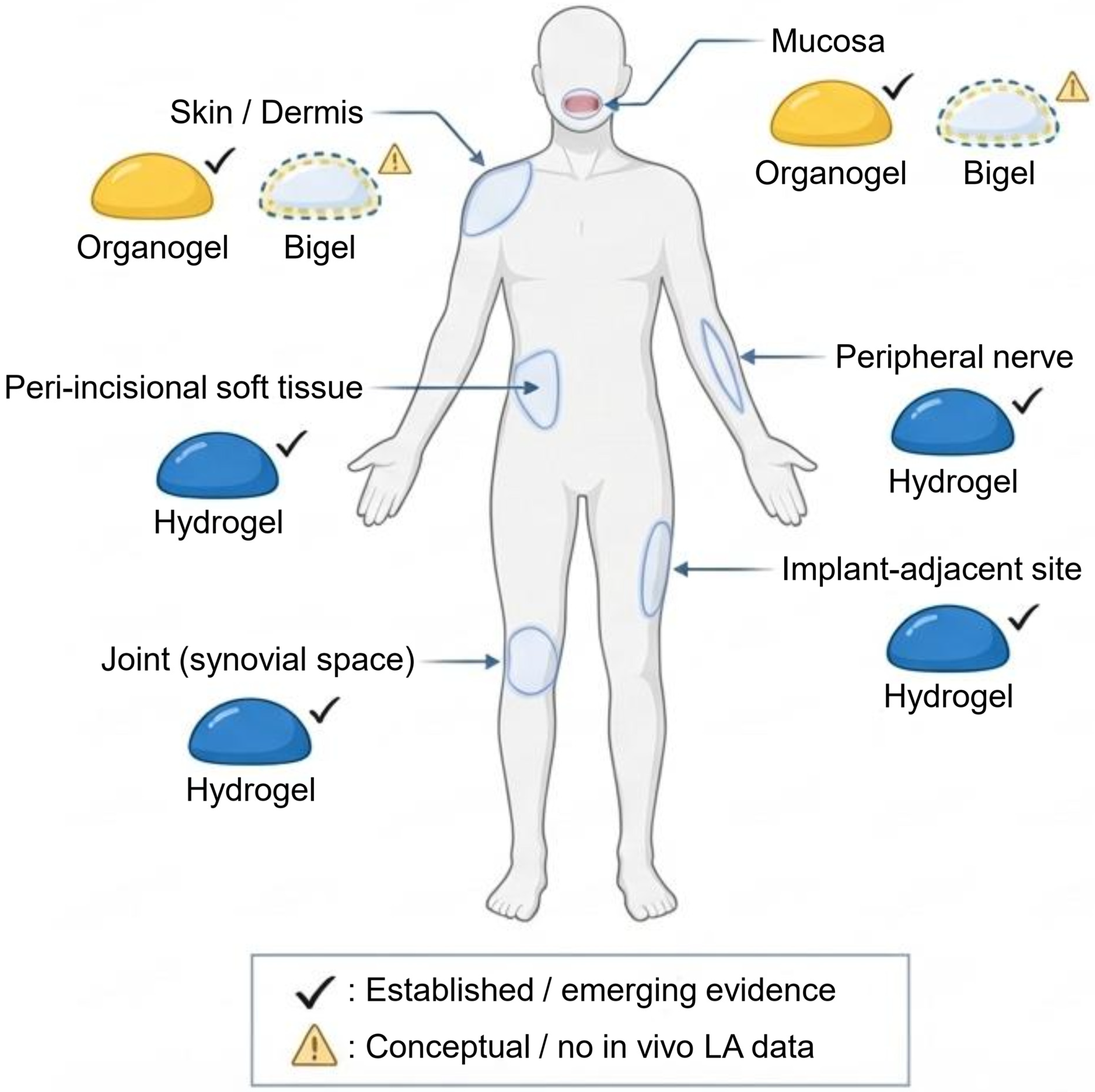| Regulatory maturity | Multiple approved products (topical, mucosal, wound); injectable depots investigational | No approved LA organogels; mostly compounded preparations | Preclinical formulation-stage only; no PK or analgesic data |