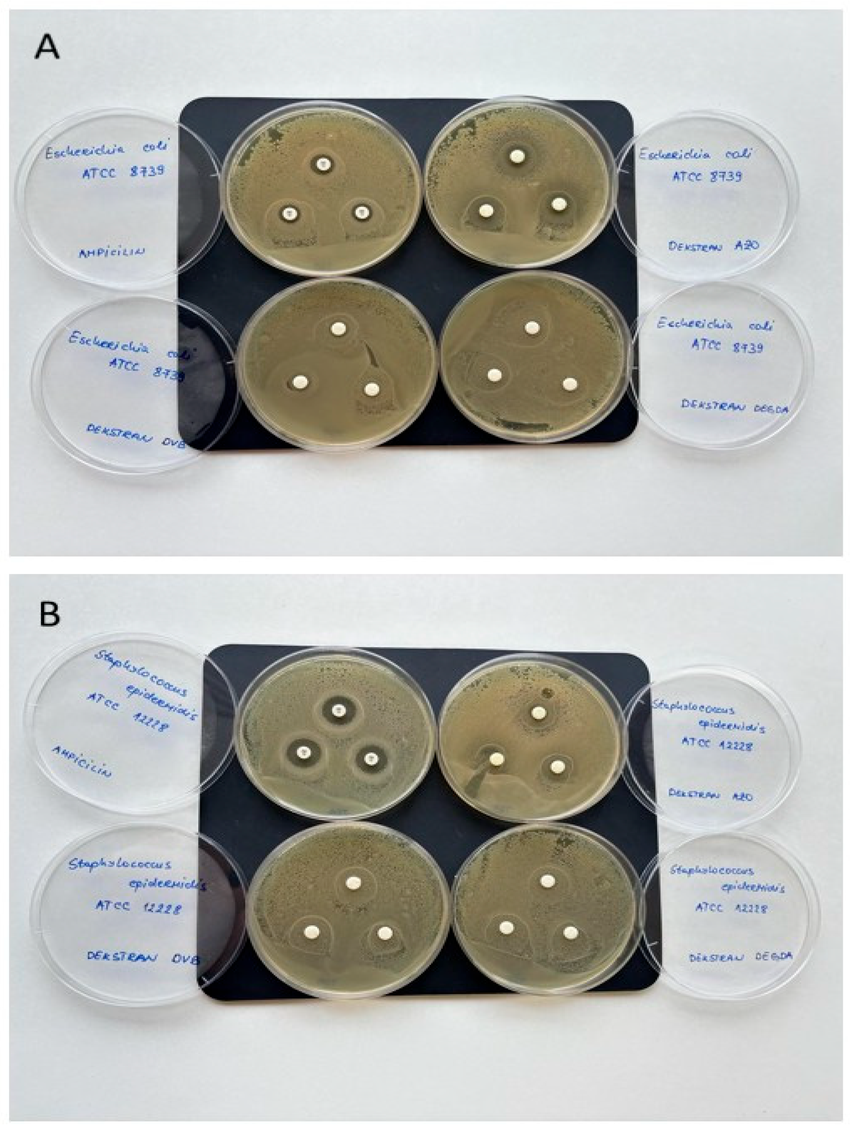 - Ghegoiu, L.; Predoi, D.; Iconaru, S.L.; Ciobanu, S.C.; Trusca, R.; Motelica-Heino, M.; Badea, M.L.; Stefanescu, T.F. Development of dextran-coated zinc oxide nanoparticles with antimicrobial properties. J. Compos. Biodegrad. Polym. 2024, 12, 1–6. [Google Scholar] [CrossRef]