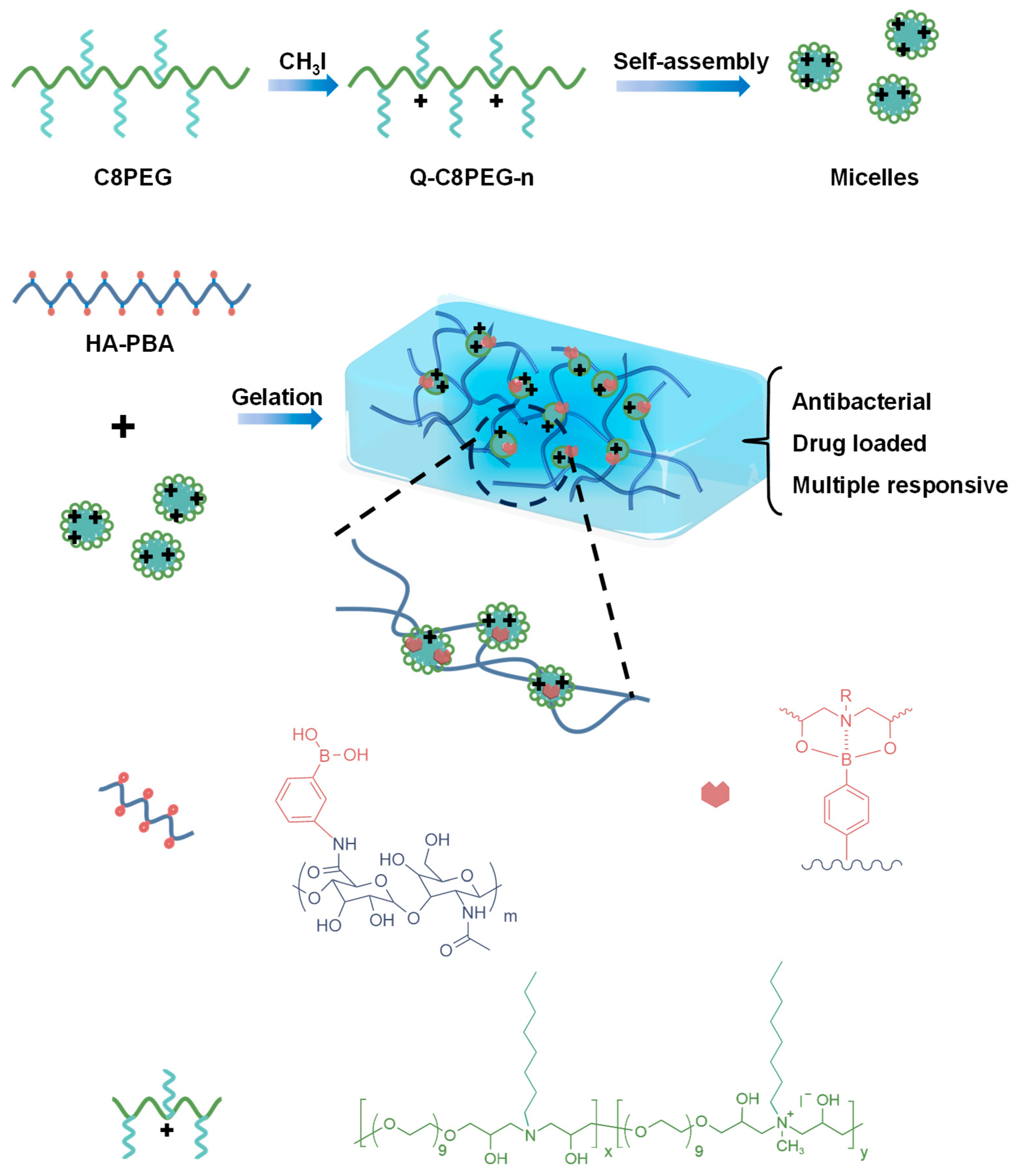 The hydrogel network relies on the reversible boronic ester crosslinks between the PBA moieties on HA-PBA and the diethanolamine units in Q-C8PEG-n, where the nitrogen atom facilitates B-N coordination to lower the pKa of the boronic acid and promote bond formation under neutral conditions. However, experiments revealed that the fully quaternized Q-C8PEG-4 failed to form a stable gel with HA-PBA, as the high density of positive charges likely induces electrostatic repulsion that disrupts the B-N coordination and hinders effective crosslinking between phenylboronic acid and diols. Consequently, Q-C8PEG-3—the copolymer with the highest quaternization degree that still permits micelle formation and balanced charge density—was selected to fabricate the hydrogel sample (denoted as Gel) with HA-PBA for further characterization. This selection ensures optimal amphiphilicity for micelle-mediated crosslinking while maintaining sufficient cationic sites for antibacterial activity.