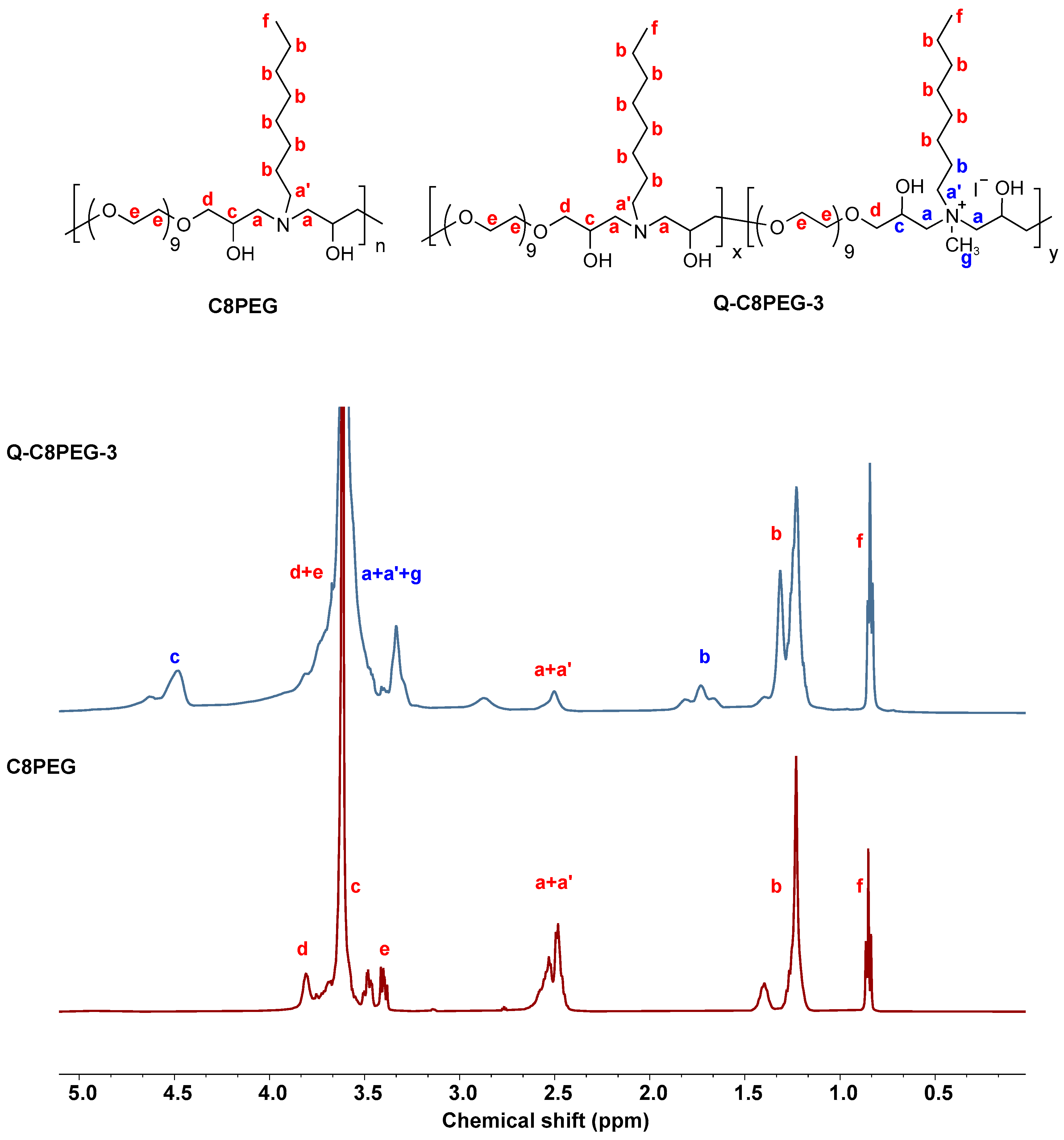1H NMR characterization was performed on C8PEG, partially quaternized polymers Q-C8PEG-1, Q-C8PEG-2, Q-C8PEG-3, as well as the fully quaternized polymer Q-C8PEG-4 (