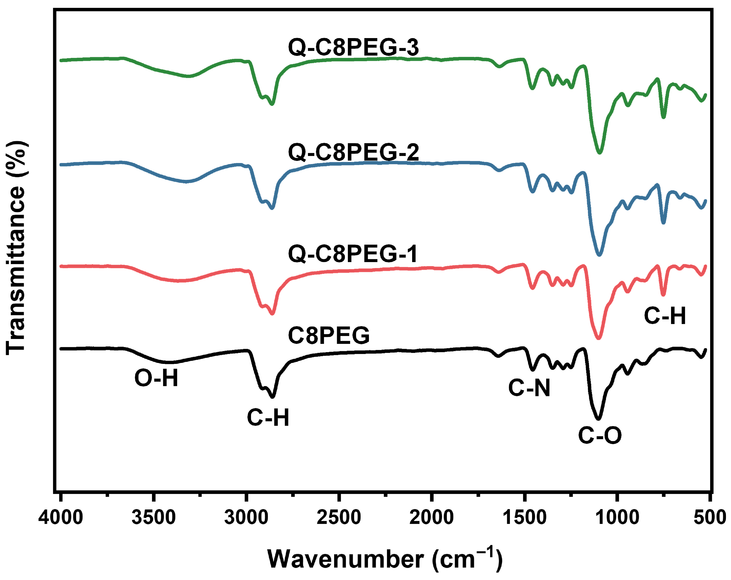 The molecular structures of the Q-C8PEG-n copolymers were further corroborated by FTIR spectroscopy. As shown in