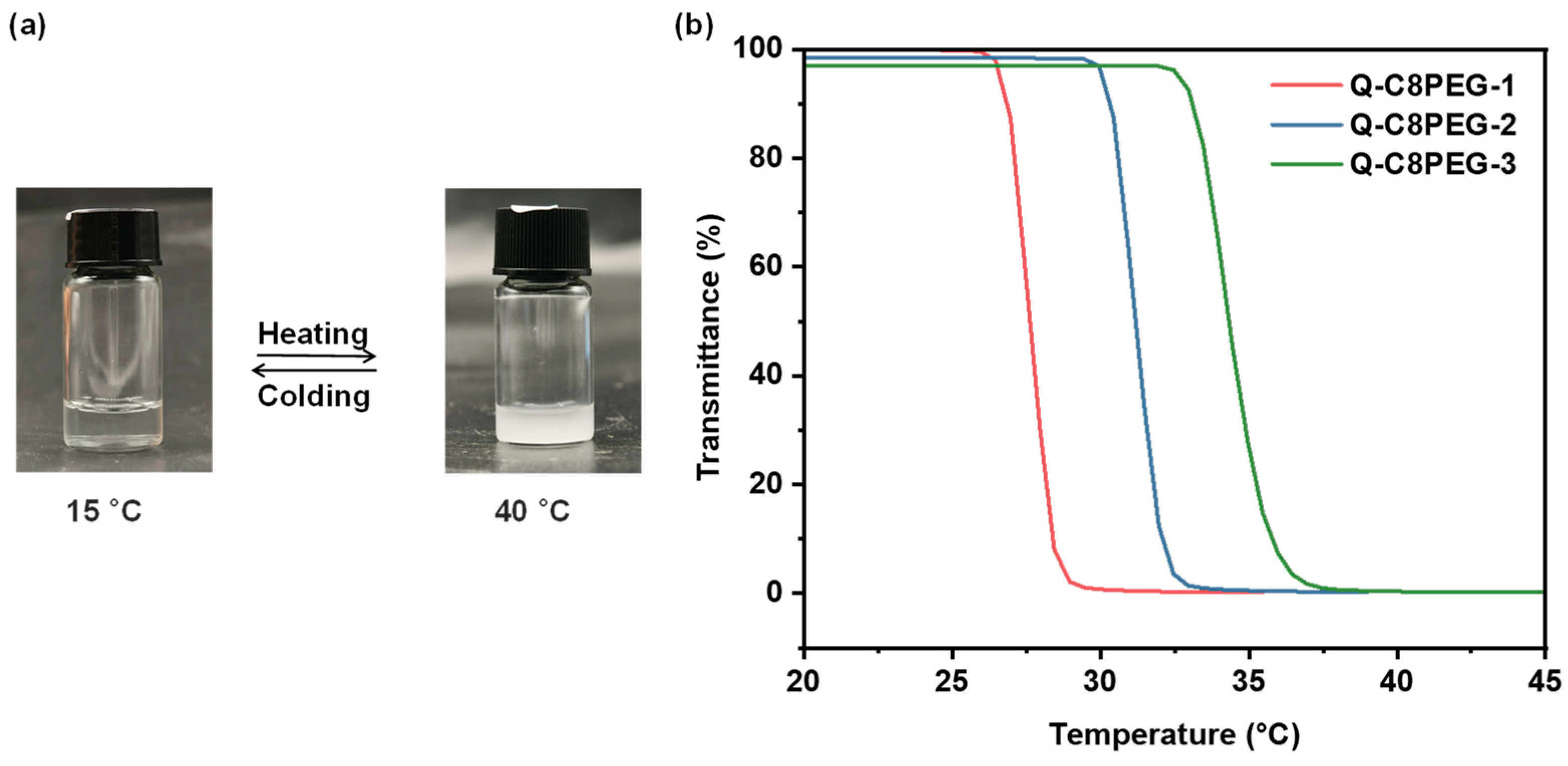 Figure 4a. At low temperatures, the polymer chains remain well-hydrated and dispersed in water, yielding a clear and transparent solution. As the temperature increases to the cloud point temperature (Tcp), the chains undergo dehydration and hydrophobic aggregation, resulting in solution turbidity and demonstrating reversible thermoresponsive behavior characteristic of lower critical solution temperature (LCST)-type polymers. To quantify these thermoresponsive properties, the transmittance of 3 wt% Q-C8PEG-n aqueous solutions at 700 nm was measured using variable-temperature UV-vis spectroscopy. Notably, the phase transition temperature of the non-quaternized C8PEG could not be determined, as it remained turbid even in an ice-water bath at 0 °C, indicating an LCST below this temperature due to its higher hydrophobicity.