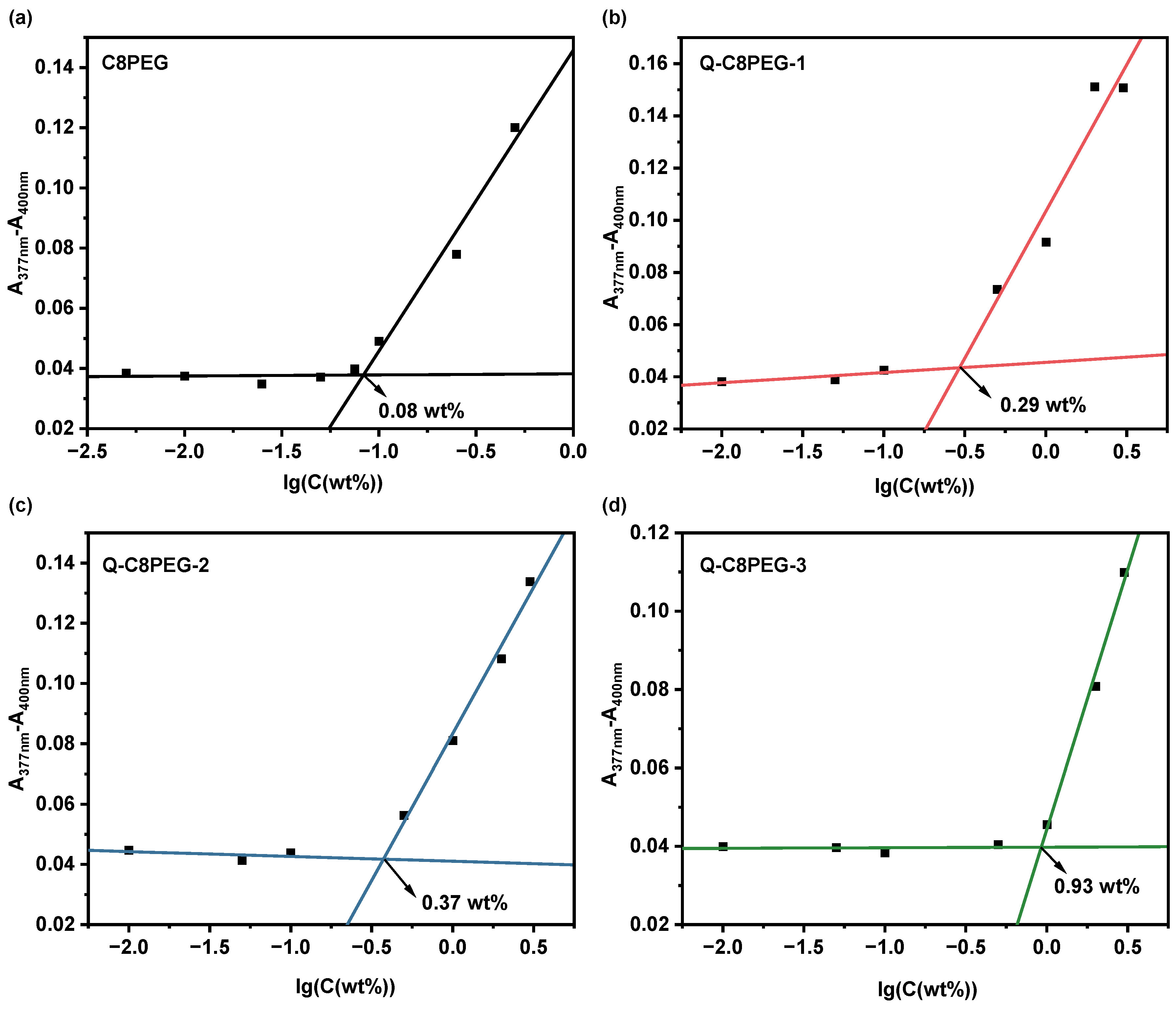22]. Above the CMC, the formation of hydrophobic micelle cores enables the encapsulation of DPH, resulting in a marked increase in its absorbance due to the dye’s enhanced solubility in the nonpolar environment. Conversely, below the CMC, DPH remains poorly solubilized in the aqueous phase, yielding low absorbance signals. The CMC values for C8PEG and Q-C8PEG-n were determined by plotting the absorbance at 377–400 nm against the logarithm of the polymer concentration and identifying the inflection point via linear fitting.