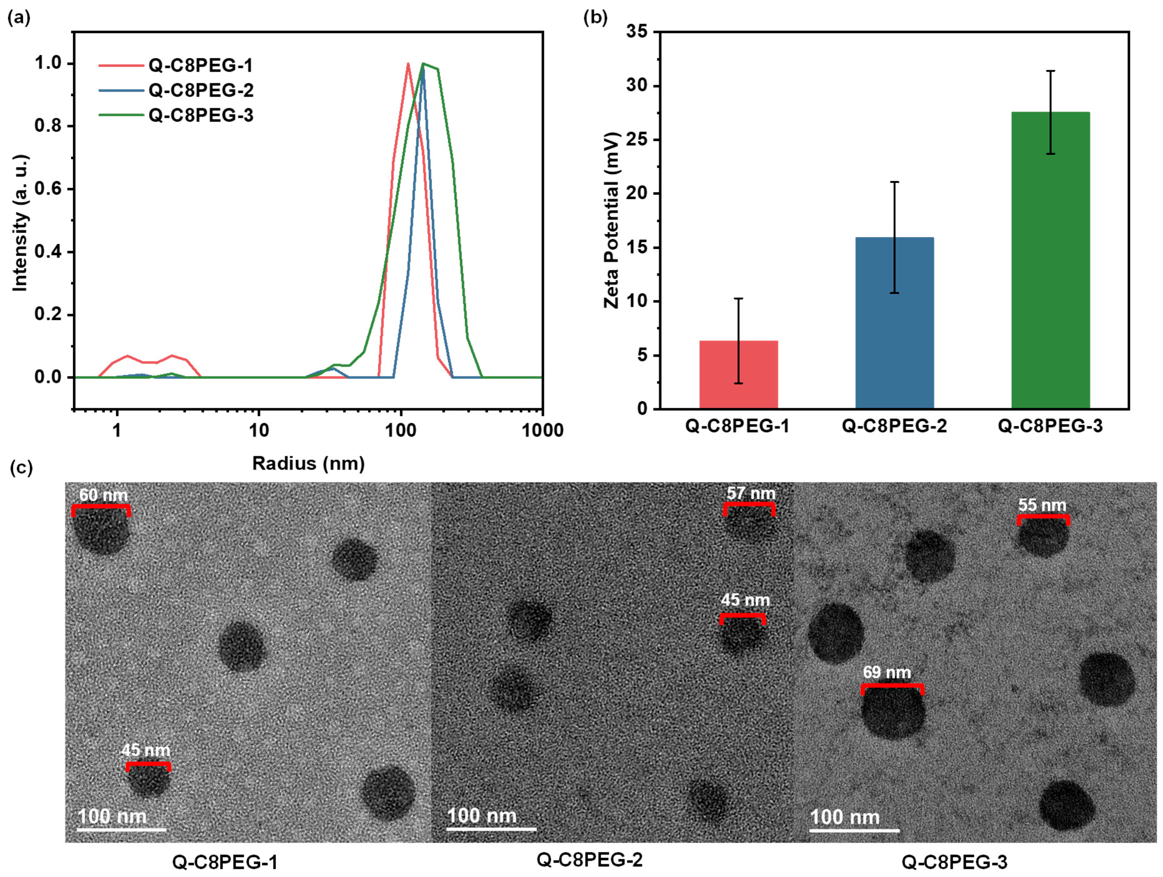 Figure 6, the TEM images of micelles formed by Q-C8PEG-1, Q-C8PEG-2, and Q-C8PEG-3 revealed spherical structures with diameters in the range of 50–70 nm, which are consistently smaller than the hydrodynamic diameters obtained from DLS (70–126 nm). This size discrepancy is typical for hydrated soft nanomaterials and can be attributed to the evaporation of the surrounding hydration layer during TEM sample preparation, coupled with the low electron contrast of the extended PEG segments in the micellar corona.