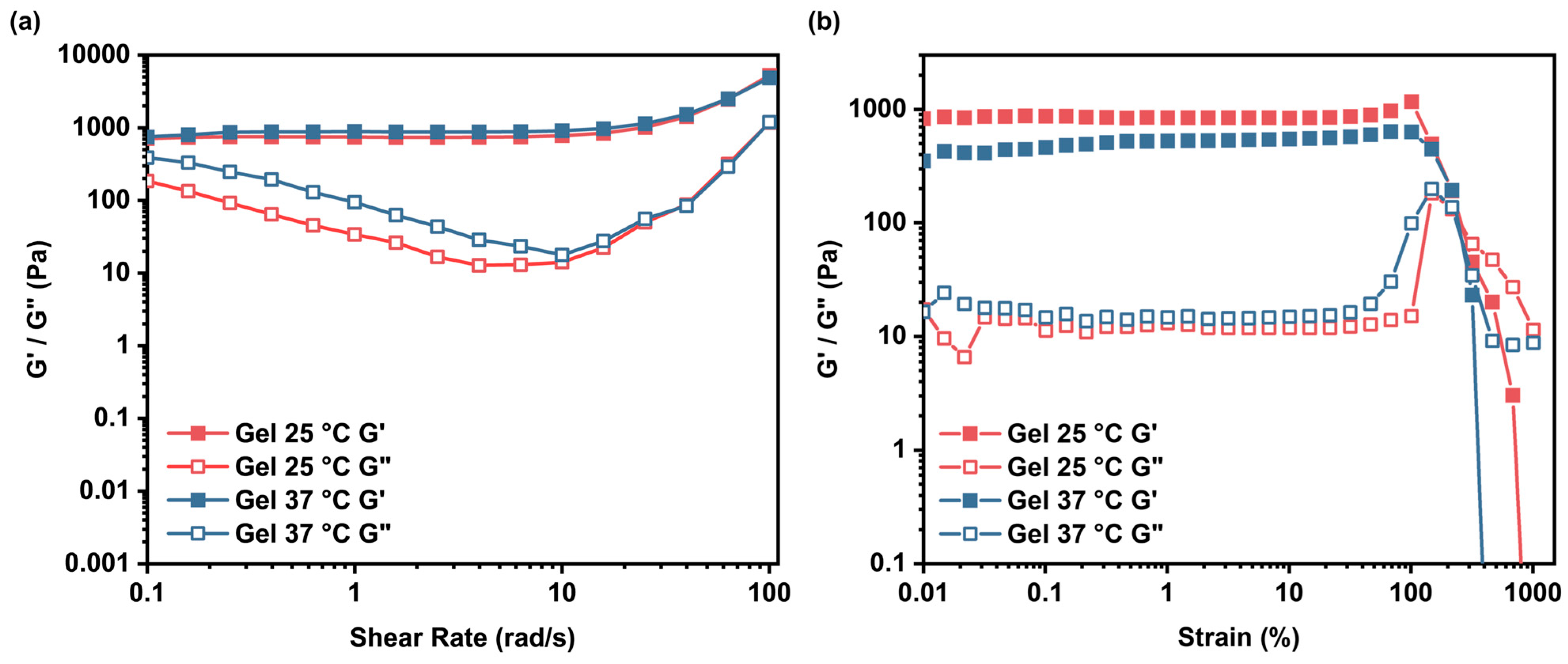 To assess the mechanical properties of the Gel, rheological measurements were conducted using a rotational rheometer. Strain amplitude sweeps (at a fixed angular frequency of 10 rad/s) and angular frequency sweeps (at a fixed strain amplitude of 0.1%) were performed at both 25 °C and 37 °C. As shown in