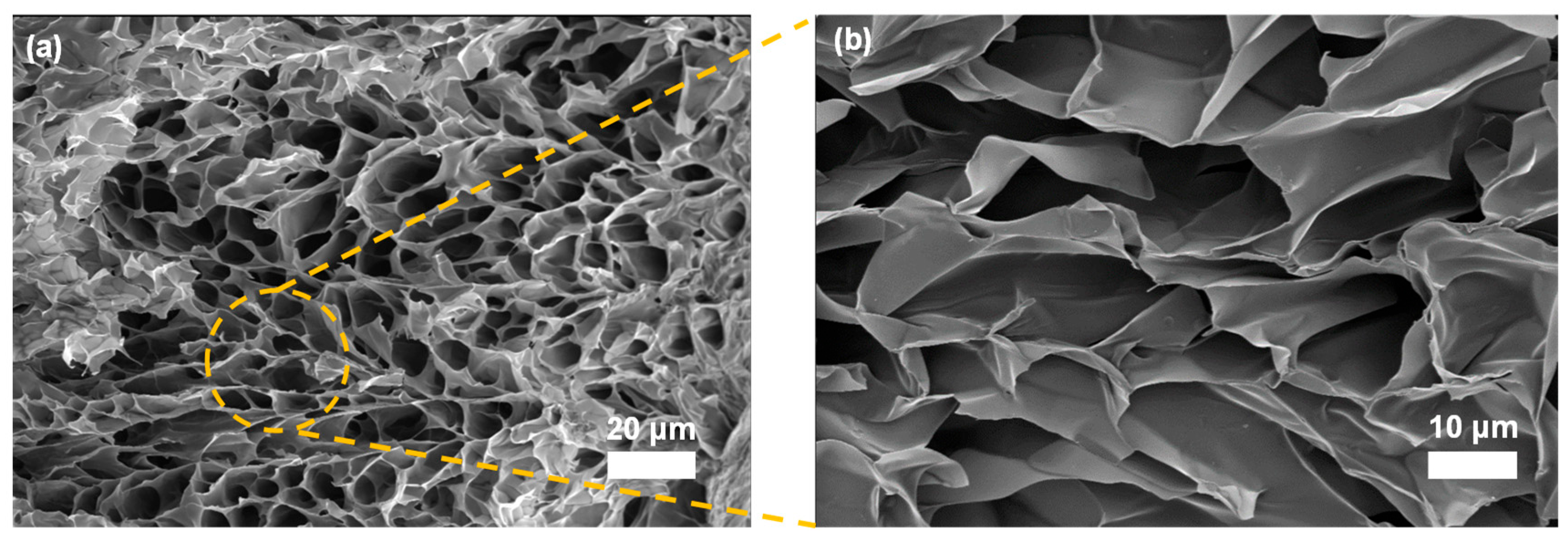 Figure 9a, b depict the overall and magnified views, respectively, revealing a three-dimensional interconnected porous network with pore sizes predominantly in the 8–15 µm range. This porosity arises from the phase separation during micelle-mediated crosslinking and subsequent freeze-drying, where the amphiphilic Q-C8PEG-3 micelles act as templates, creating voids upon solvent sublimation. Such a microporous structure facilitates efficient nutrient diffusion, waste removal, and cell infiltration, making it ideal for tissue engineering scaffolds.