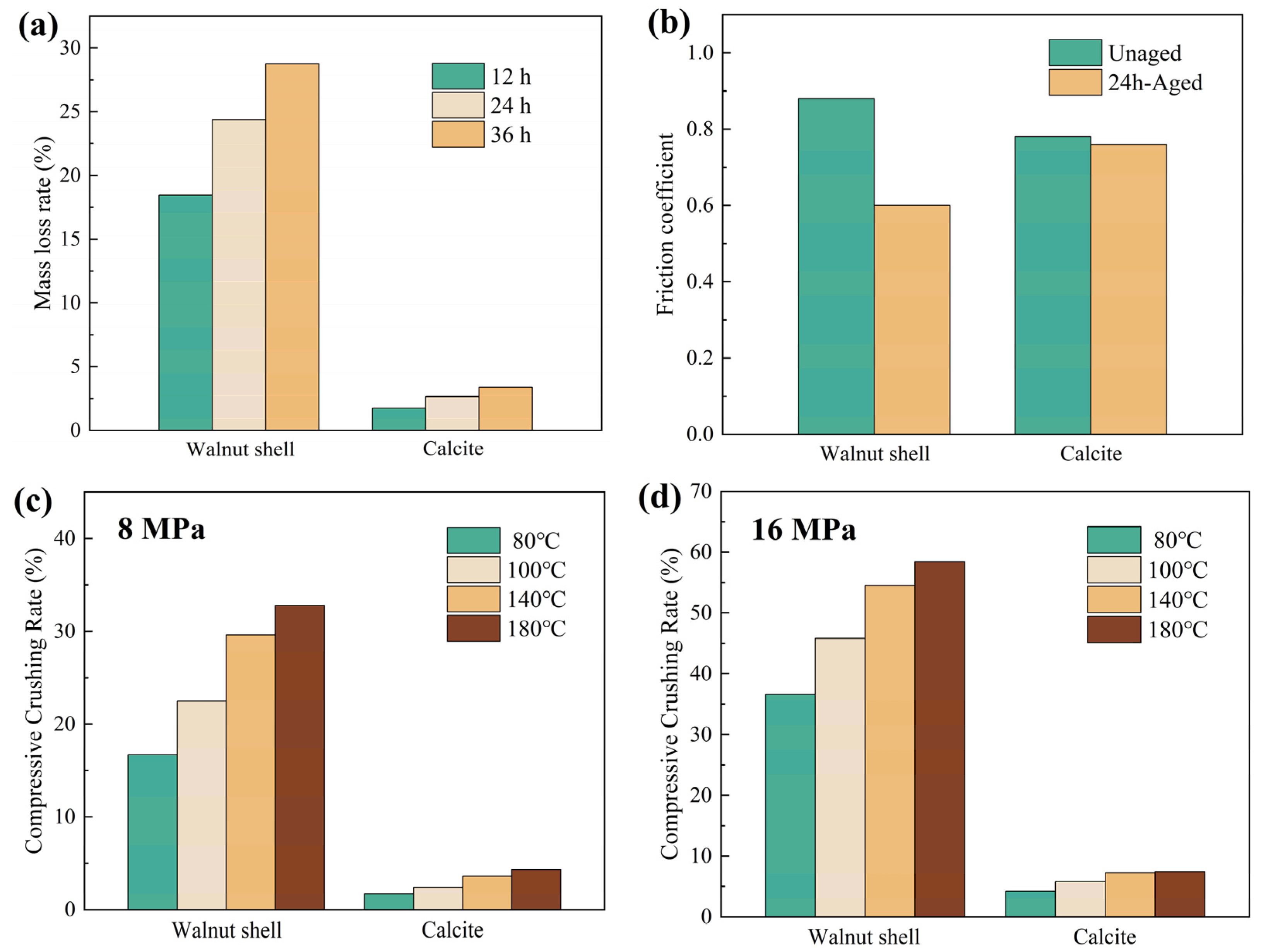 Figure 1c,d show the compressive resistance of the two particles under different confining pressures. Under the same temperature and pressure conditions, calcite particles exhibited significantly lower compressive crushing rates. At 8 MPa, the crushing rate of walnut shell particles exceeded 15% across all tested temperatures; when the pressure increased to 16 MPa, their crushing rate further rose to over 35%, indicating high sensitivity to pressure. In comparison, the crushing rate of calcite particles was only 1.7–4.3% at 8 MPa and increased to only 4.2–7.4% at 16 MPa, demonstrating superior compressive strength and greater suitability for lost circulation operations in high-pressure formations.