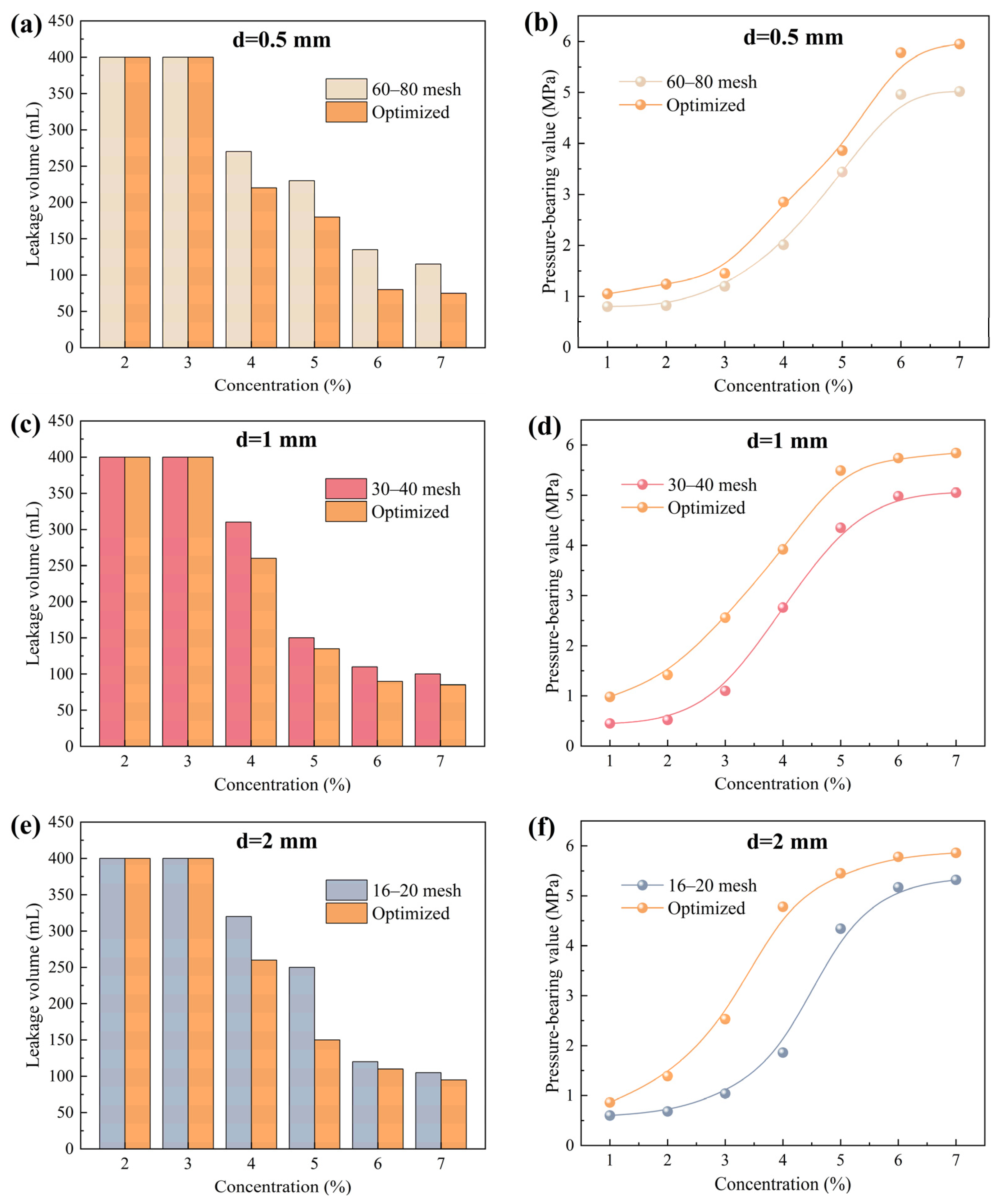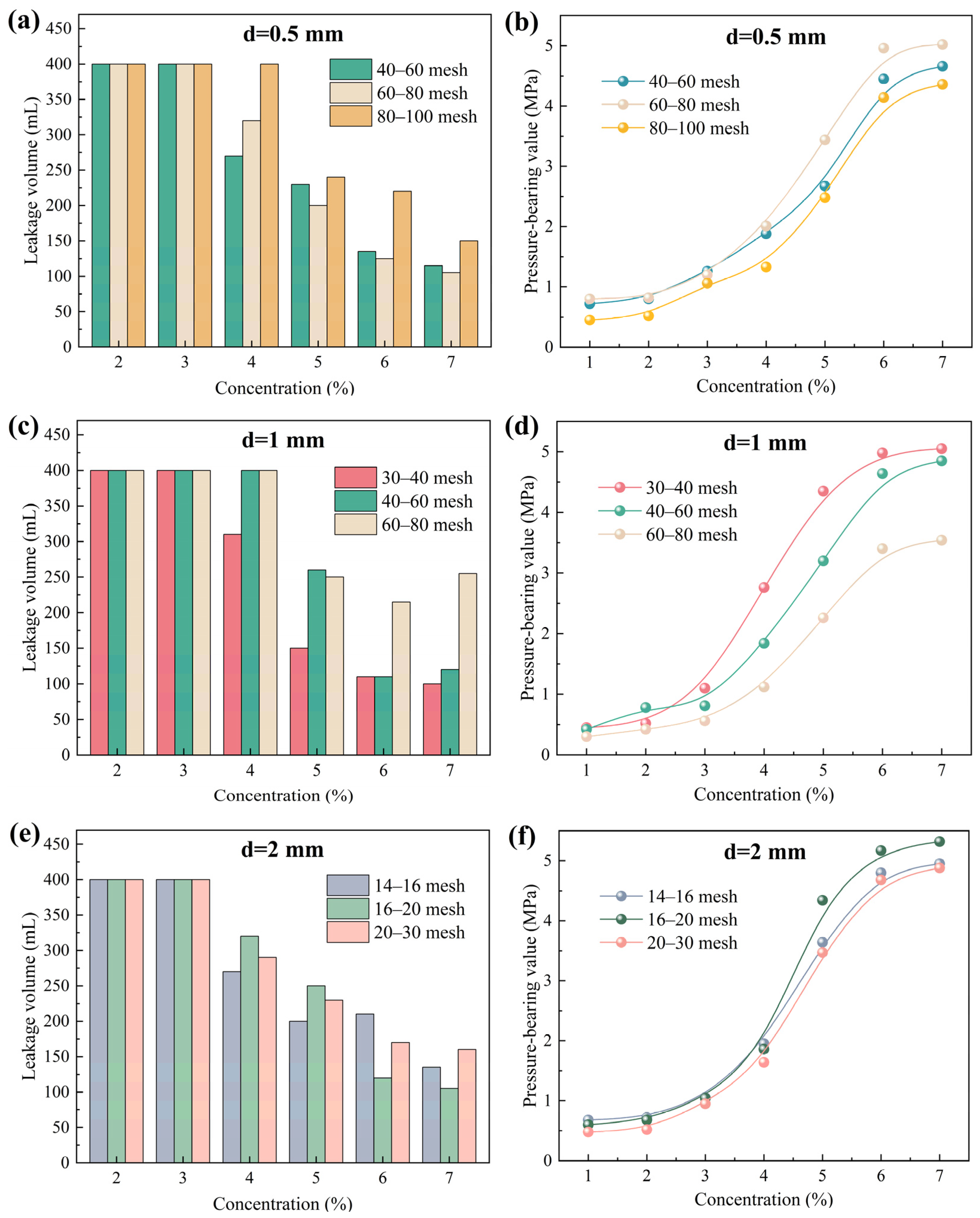 Figure 2, as the concentration of calcite particles increased, the drilling fluid loss gradually decreased, while the pressure-bearing capacity significantly improved, indicating a gradual increase in plugging success rate. This is primarily because the increased concentration of the plugging agent provides more effective particles per unit volume for bridging, making it easier to form a stable and dense sealing layer in the fractures, thereby enhancing the overall strength and integrity of the plugging structure. For the 0.5 mm fracture, 60–80 mesh calcite particles exhibited the best plugging performance, with the lowest fluid loss and the highest pressure-bearing capacity. At a particle concentration of 7%, the fluid loss was approximately 105 mL, and the pressure-bearing value reached 5.02 MPa. When the fracture width increased to 1 mm, 30–40 mesh calcite particles demonstrated superior plugging performance. At a particle concentration of 7%, the fluid loss was approximately 100 mL, and the pressure-bearing value reached 5.05 MPa. For the 2 mm fracture, 16–20 mesh calcite particles provided the best plugging effect. At a particle concentration of 7%, the drilling fluid loss was approximately 105 mL, and the pressure-bearing value reached 5.32 MPa. These results indicate that the plugging effectiveness of calcite particles depends on the matching relationship between their particle size and the fracture width. When the particle size corresponds to the fracture aperture, effective initial bridging can be achieved, leading to the formation of a dense and stable sealing layer.