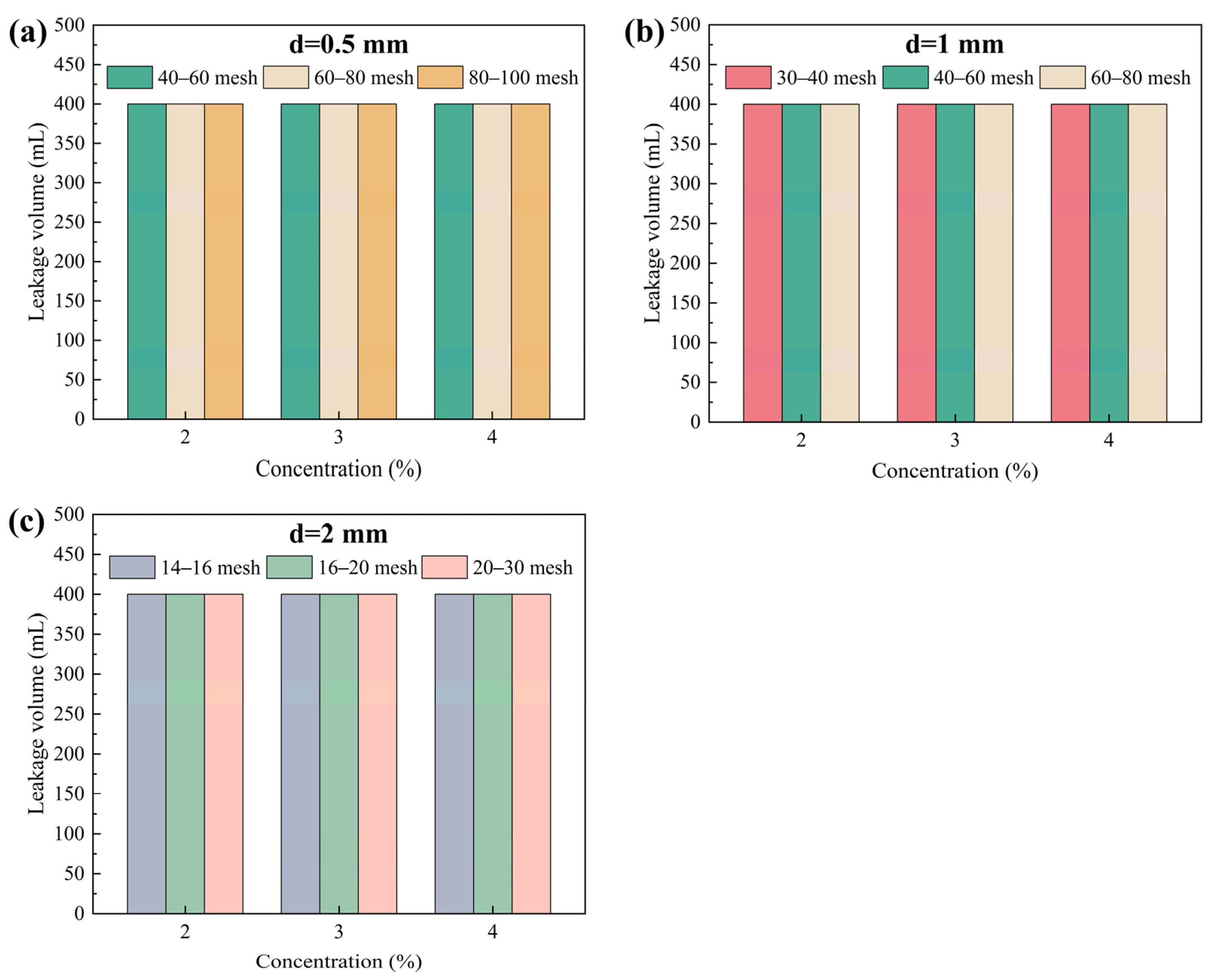 Figure 4, when the concentration of elastic gel particles of different sizes ranged from 2% to 4%, the leakage volume remained unchanged, with the entire 400 mL of test fluid being lost (100% loss rate). Effective plugging was not achieved for any of the three fracture widths, indicating that elastic gel particles alone are difficult to autonomously form a stable bridging and plugging structure. Therefore, in practical lost circulation applications, elastic gel particles need to be used in combination with other types of plugging agents to improve the overall plugging efficiency through multi-component synergy.