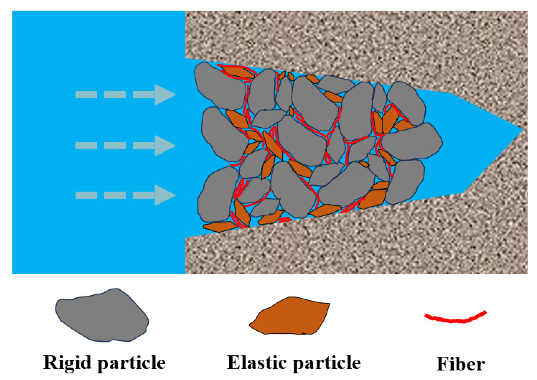 19]. Rigid particles primarily rely on a “bridging” mechanism to form supports at fracture throats; flaky materials act by “filling” to plug micropores; and fibrous materials enhance the integrity and compactness of the plugging structure through a “network-forming” effect [