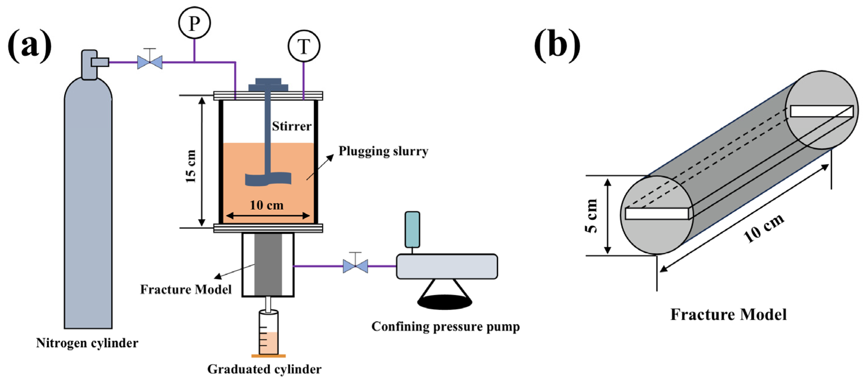 Calcite particles (14–100 mesh) with a density of 2.6–2.94 g/cm3 and a decomposition temperature of 898.6 °C were supplied by Tianjin Ruijinte Chemicals Co., Ltd., Tianjin China. Walnut shell particles (20–50 mesh), with a compressive strength of up to 23.40 kgf, were obtained from the same supplier. Elastic gel particles (14–100 mesh), consisting of commercially available cross-linked polyacrylamide beads, were provided by Shenzhen Zhongning Technology Co., Ltd., Shenzhen, China. These gel particles have a density of 1.17–1.27 g/cm3, an elastic modulus of 80 MPa, and a deformation recovery rate exceeding 85%. They swell approximately 2–3 times in aqueous solution, reaching saturation within 2–4 h. Polypropylene fibers with a length of 1.5–5 mm, a diameter of 20–30 μm, and a density of 0.9–0.92 g/cm 3 were from Shanghai Macklin Biochemical Co., Ltd., Shanghai, China. Fracture models with slot widths of 0.5–2 mm were supplied by Qingdao Xusheng Petroleum Instrument Co., Ltd., Qingdao, China. The calcite particles were sieved, washed, and dried to remove dust and moisture. Polypropylene fibers were solvent-washed and dried to standardize their surface properties and enhance their dispersibility in water. The drilling fluid base slurry, with a density of 1.1 g/cm3, was provided by PetroChina Xinjiang Oilfield Company, Xinjiang, China, formulated with 3% bentonite, 0.3% Na2CO3, 0.2% NaOH, 0.1% potassium polyacrylamide (KPAM), 2% sulfomethylcellulose (SMC), 4% fluid loss additive SMP-1, and 2% high temperature stabilizer FBJ-1.