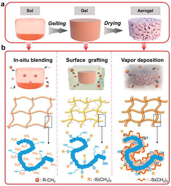 - Li, S.L.; Wang, Y.T.; Zhang, S.J.; Sun, M.Z.; Li, J.; Chu, L.Q.; Hu, C.X.; Huang, Y.L.; Gao, D.L.; Schiraldi, D.A. A Novel, Controllable, and Efficient Method for Building Highly Hydrophobic Aerogels. Gels 2024, 10, 121. [Google Scholar] [CrossRef] [PubMed]