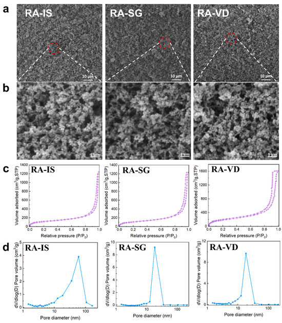 Scanning electron microscope (SEM) images of RA-IS, RA-SG and RA-VD are shown in Figure 2a,b. All samples exhibit a three-dimensional porous network constructed of interconnected nanoparticles and pores. This suggests that the methyl modification method does not affect the microstructure of RF/SiO2 aerogels significantly. N2 adsorption–desorption isotherms and pore size distribution curves of the aerogels are shown in Figure 2c,d. All samples exhibit type IV isotherms with H2 hysteresis loops, characterizing the mesoporosity of the aerogels [48,49]. The pores of RA-IS distribute in a wide range of 5–100 nm, and most pores concentrate around 60 nm. However, a narrower pore distribution is observed for RA-SG (7–35 nm) and RA-VD (7–35 nm), and most pores of RA-SG and RA-VD concentrate around 18 nm. This is attributed to the fact that large voids can be blocked after surface grafting and the vapor deposition of HMDS species on the RF/SiO2 framework, generating smaller pores. In addition, the volume shrinkage can occur during aging, solvent exchange, and drying processes.