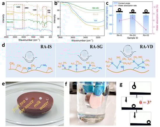 (a,b) FTIR spectra of RA, RA-IS, RA-SG, and RA-VD; (c) water contact angles and liquid water absorption rates of RA-IS, RA-SG, and RA-VD; (d) water-repellent mechanisms of RA-IS, RA-SG, and RA-VD; (e) photograph of a floating RA-IS monolith with different liquid droplets on its surface; (f) demonstration of hydrophobicity in liquid water; (g) sliding of water droplets on RA-IS.