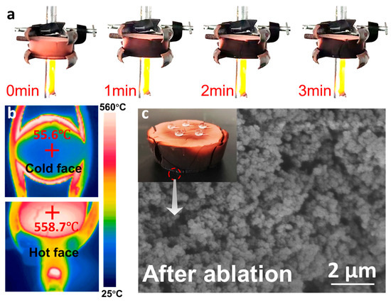 The RA-IS aerogel, identified as the most thermally resistant formulation, was subjected to an alcohol burner flame ablation test using a 2 cm thick specimen. After continuous flame exposure for 3 min (Figure 7a), the sample maintained structural integrity without visible collapse or macroscopic deformation, demonstrating robust thermal shielding. Infrared thermography (Figure 7b) revealed a steep through-thickness gradient: the flame-facing surface rapidly reached high temperatures, whereas the back surface remained near ambient temperature, yielding a temperature drop exceeding 500 °C across 2 cm. SEM observations (Figure 7c) show partial sintering and localized shrinkage after exposure, yet the porous skeleton remains continuous, evidencing the high-temperature structural stability of the RA-IS network. Consistently, static water contact angle measurements on the non-impinged face indicate that hydrophobicity is largely retained, underscoring the durability of the hydrophobic modification under flame conditions.
