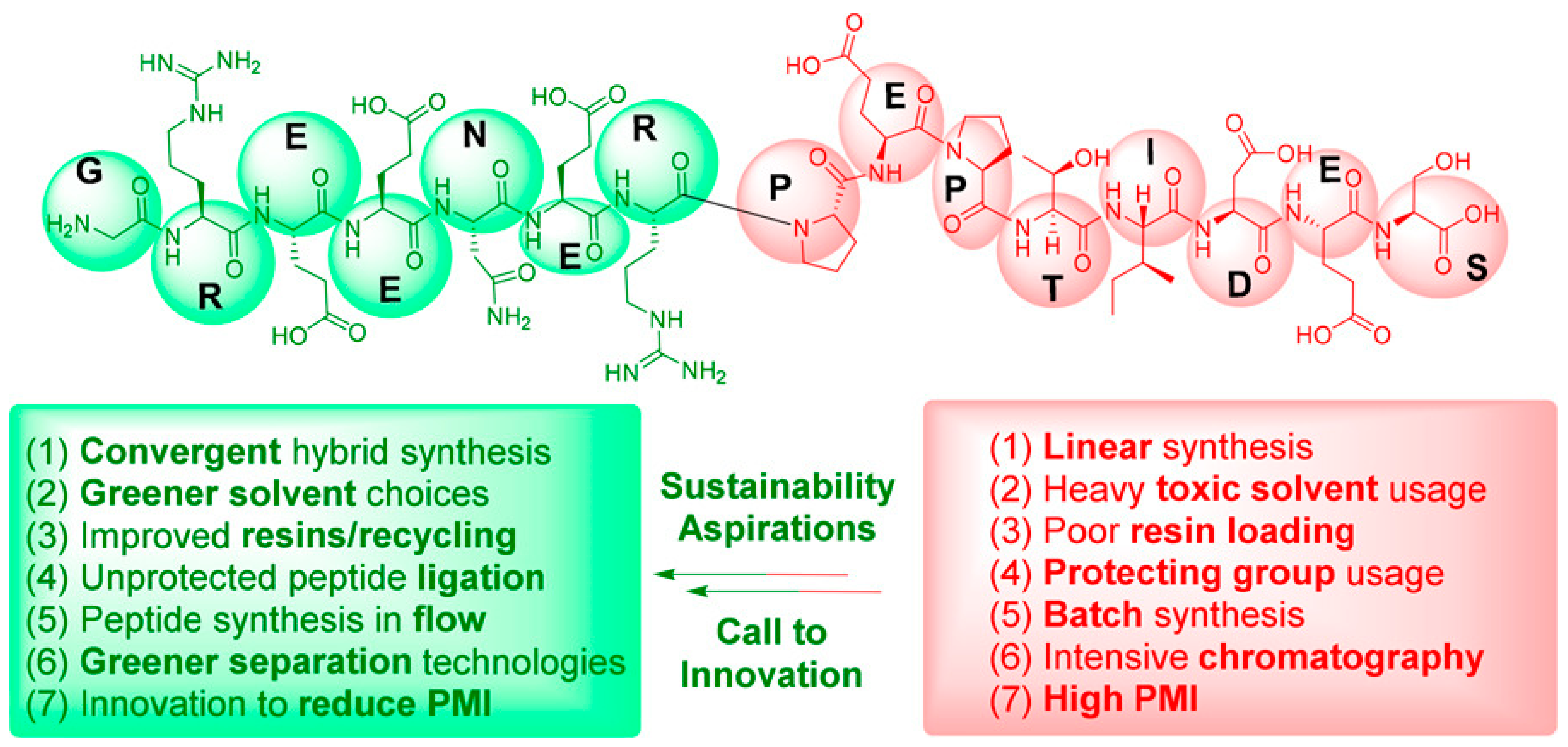 - Isidro-Llobet, A.; Kenworthy, M.N.; Mukherjee, S.; Kopach, M.E.; Wegner, K.; Gallou, F.; Smith, A.G.; Roschangar, F. Sustainability Challenges in Peptide Synthesis and Purification: From R&D to Production. J. Org. Chem. 2019, 84, 4615–4628. [Google Scholar] [CrossRef]