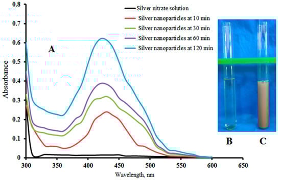 UV-Vis spectroscopy is one of the most popular methods for structural characterization of silver nanoparticles. The UV-Vis absorption spectra of the synthesized AgNPs were obtained against deionized water to investigate the synthesis and stability of the AgNPs [20]. The UV-Vis absorption spectra of the AgNPs at various time intervals are recorded and shown in Figure 1A. The AgNPs synthesis during the reduction process is indicated by the color change in the reaction solution from colorless to dark brown, which can be visually observed. AgNPs have free electrons, which produce a surface plasmon resonance absorption peak. The colors of the silver nitrate and AgNPs solution (after 2 h) are shown in Figure 1B,C, respectively. The evolution of the surface plasmon absorbance peaks of silver nanoparticles during the first two hours is shown in Figure 1A. The solution color was changed within seconds to pale yellow, and then to dark brown, due to the plasmon formation at the colloid surface, indicating the synthesis of AgNPs [21].