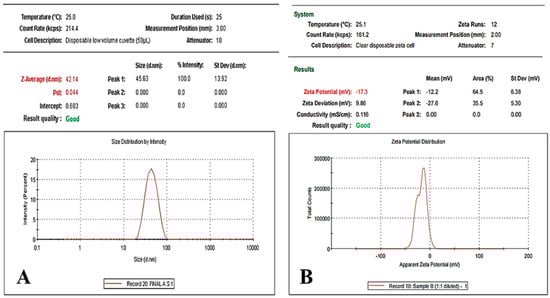 The results obtained showed that the average particle size of the synthesized AG-loaded AgNPs is 42.14 nm with a polydispersity index (PDI) of 0.044 (Figure 3A). Another important characterization parameter of AgNPs is the determination of nanoparticle surface charge (zeta potential). The magnitude of the zeta potential signifies the degree of electrostatic repulsion between similarly charged neighboring particles in a dispersion, which, in turn, dictates the stability of colloidal dispersions [25]. As illustrated in Figure 3B, the synthesized AG-loaded AgNPs had a zeta potential of −17.3 ± 1.12 mV, indicating their stability.
